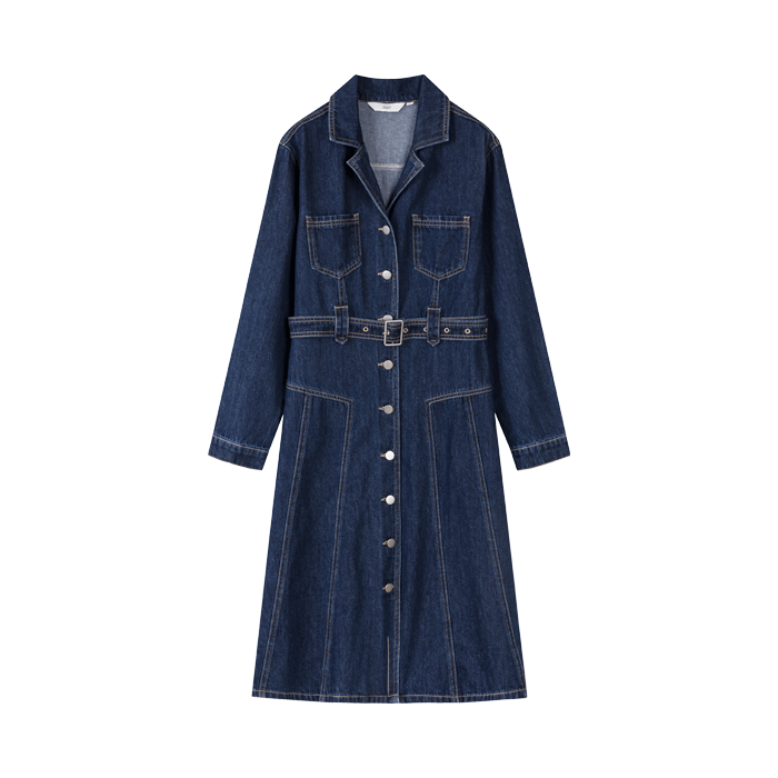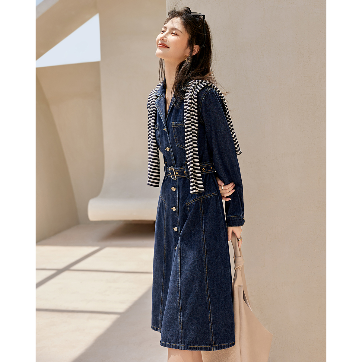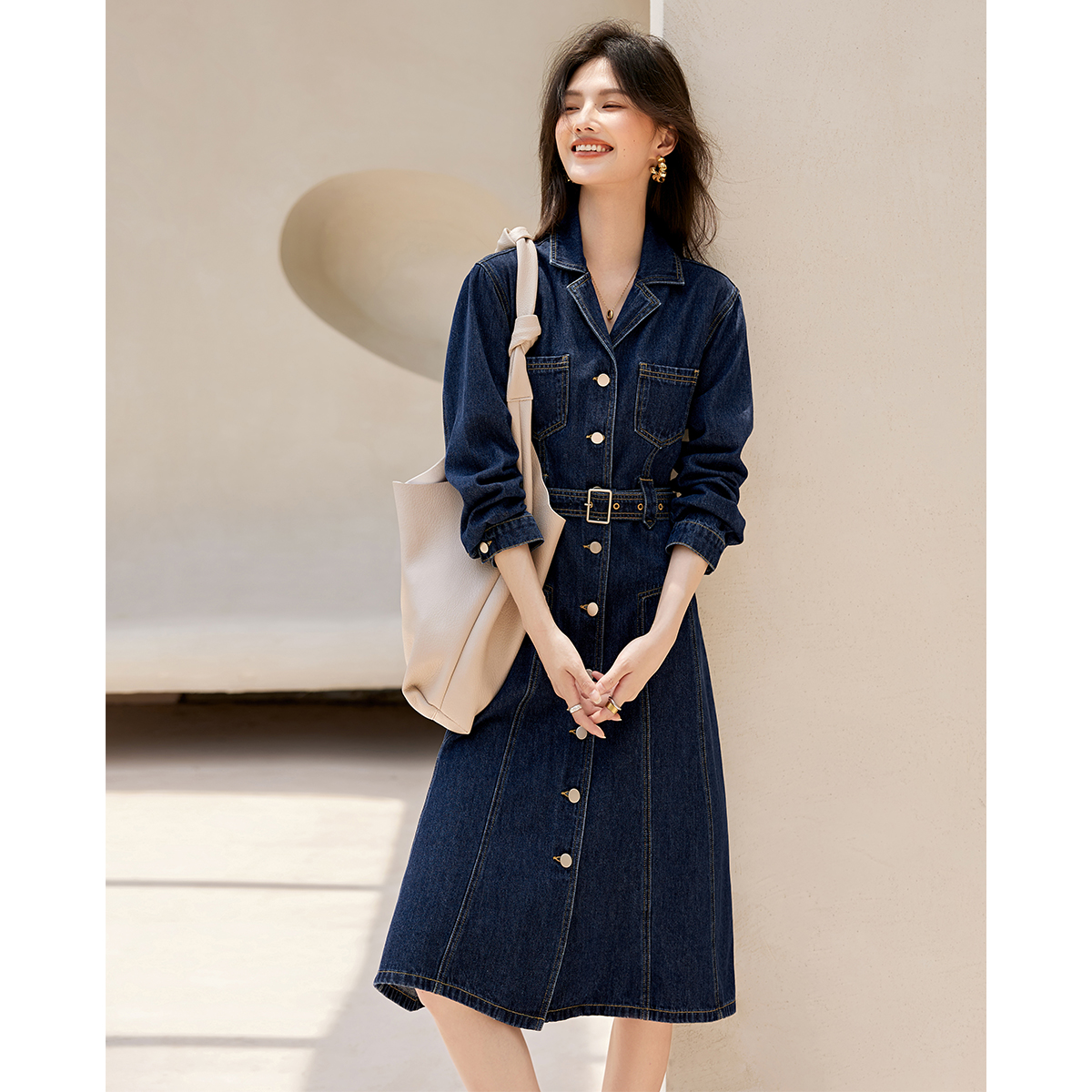 XWI/欣未复古水洗工艺牛仔连衣裙女2024年秋季收腰显瘦中长款裙子