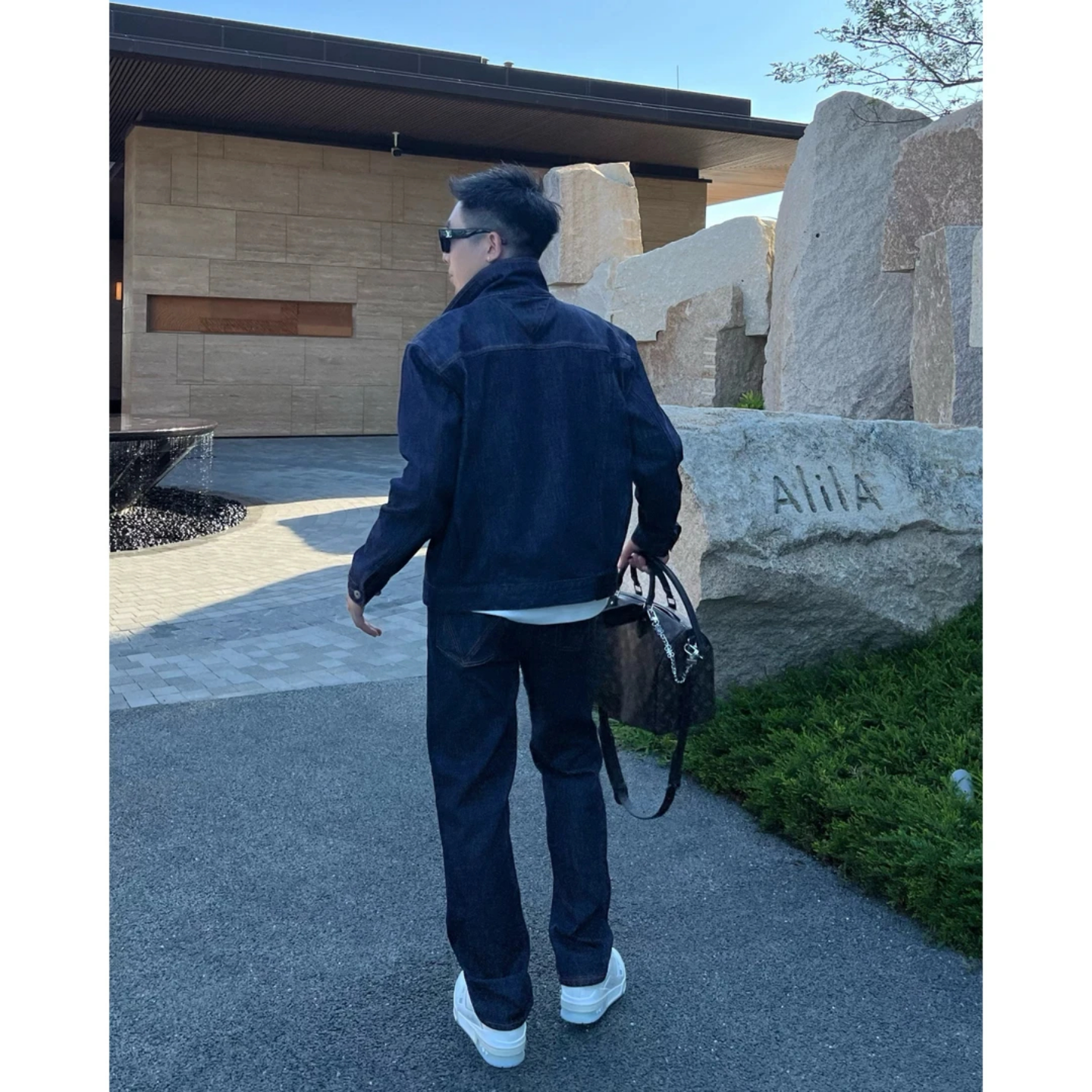 【牛仔套装】秋季新款时尚明线拼接翻领外套休闲长裤两件套男女款