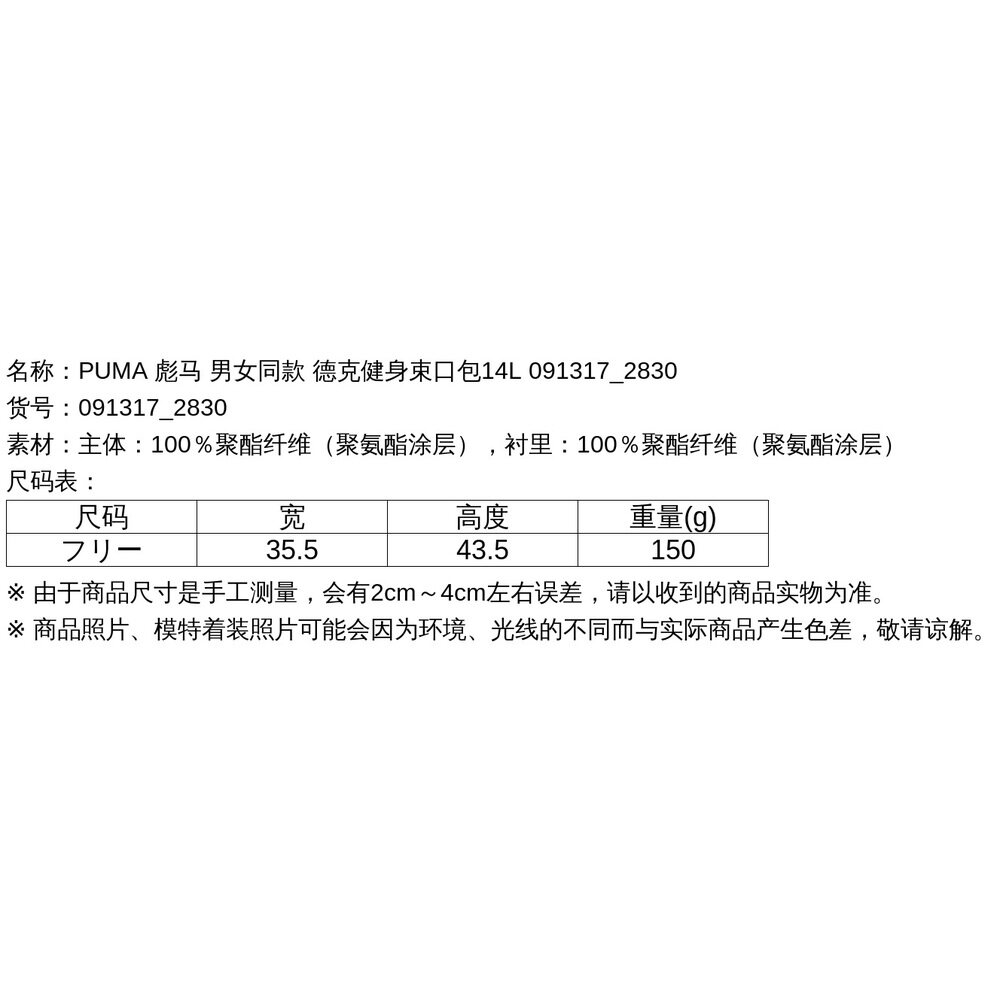 1h可退 日本直邮PUMA 彪马 男女同款 德克健身束口包14L 091317_2