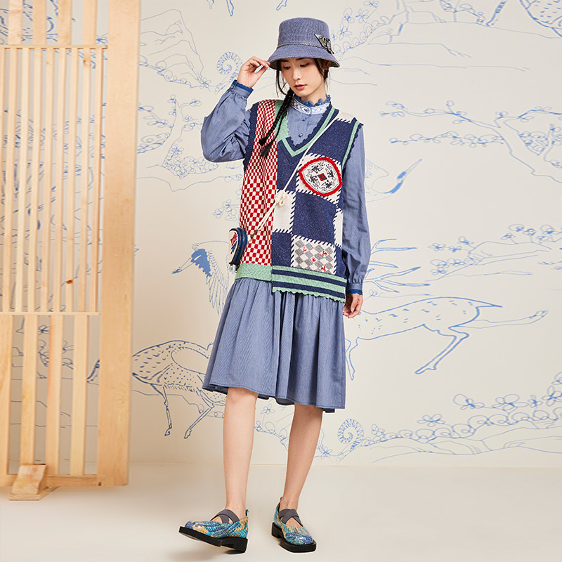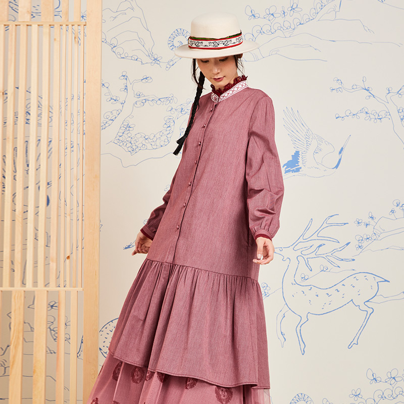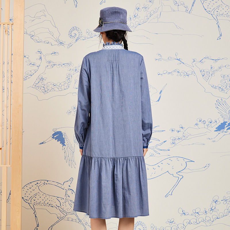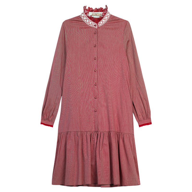 一城画一春季休闲百搭通勤宽松小立领中款长袖连衣裙红条/蓝条女