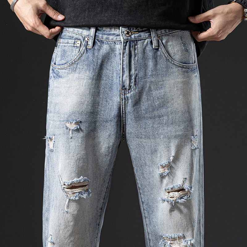 乞丐破洞浅色牛仔裤男款秋季新款潮流直筒机车浅蓝色纯棉九分裤子