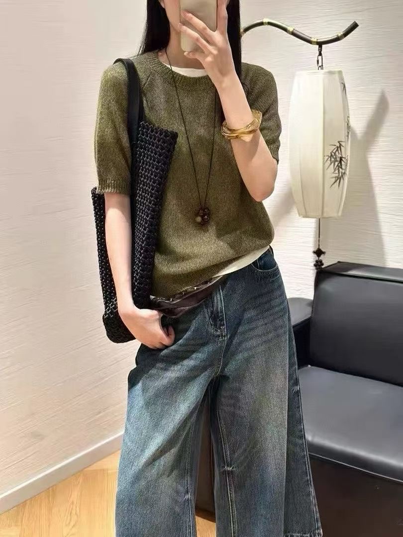 欧洲站2025早秋新款欧货时尚圆领纯色百搭显瘦短袖针织衫上衣女