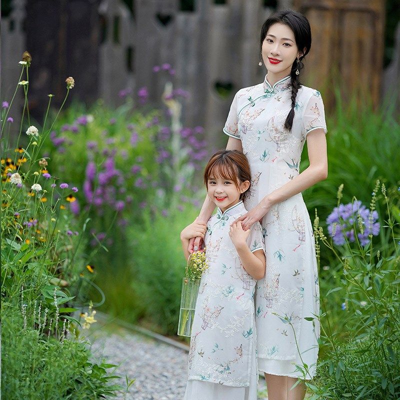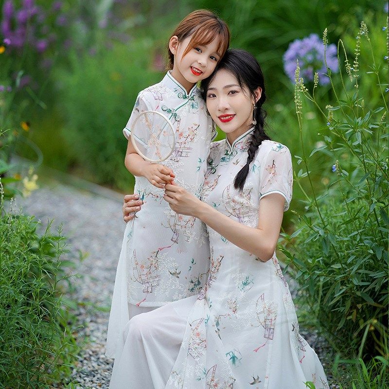 亲子旗袍母女装宽松2022夏新款中国风中长款雪纺儿童连衣裙小清新