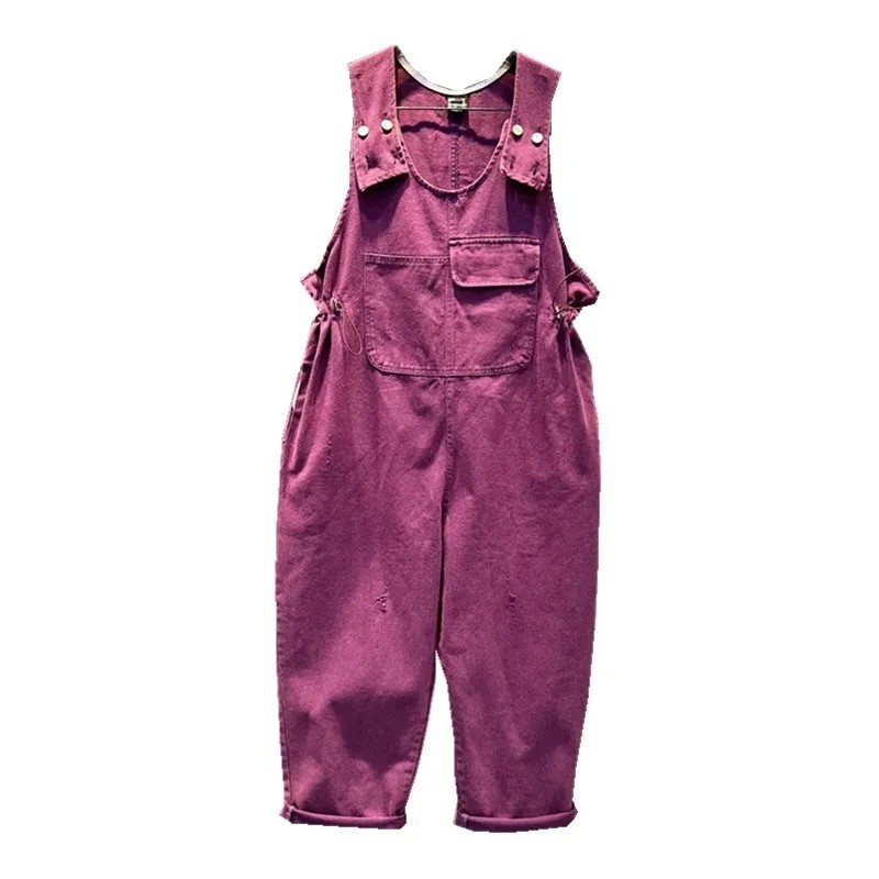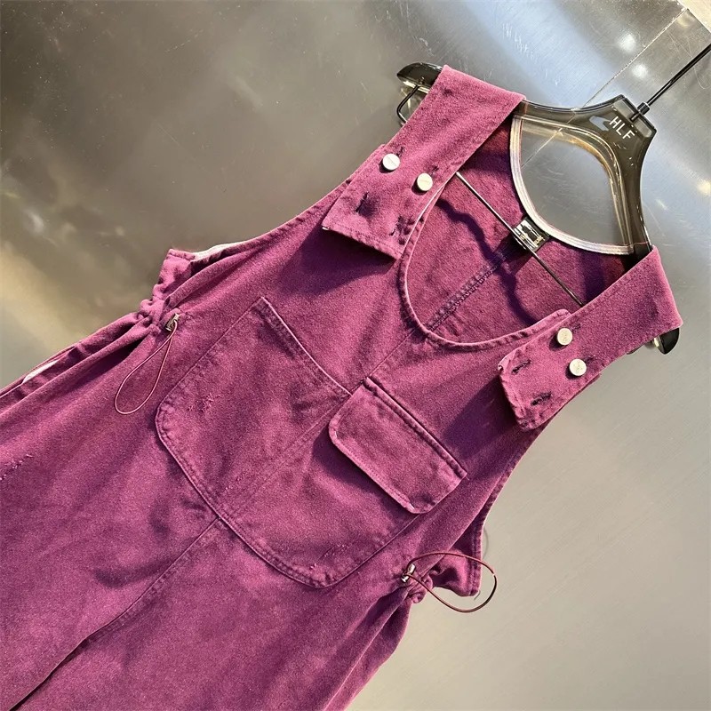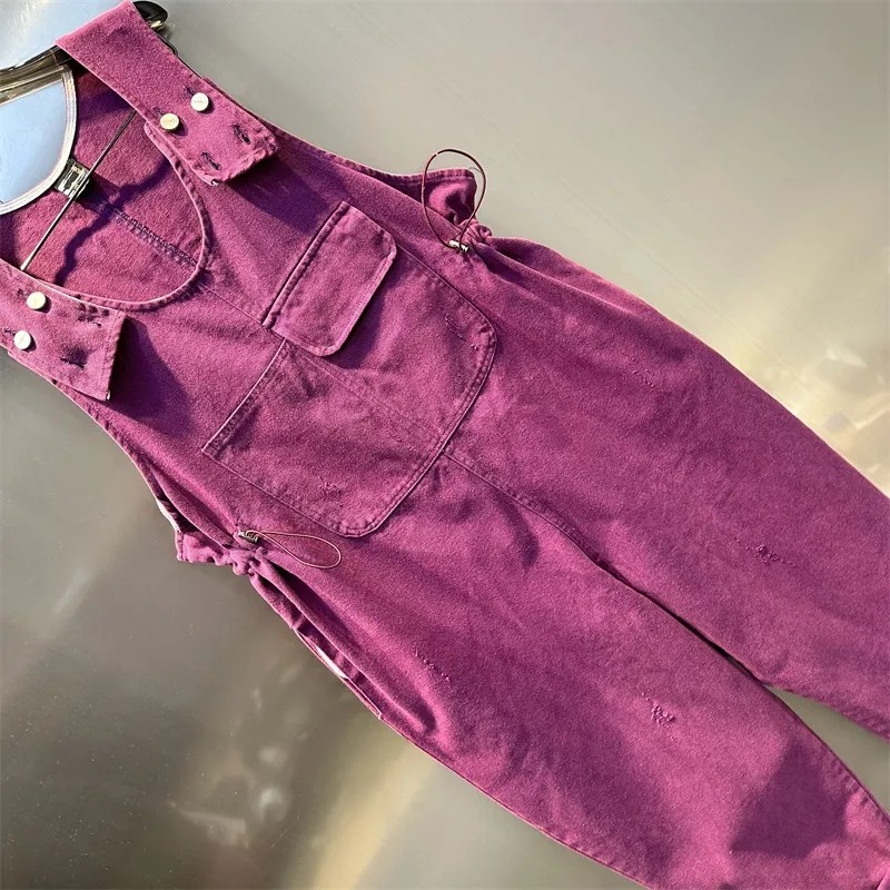 2024年春季新款紫色潮牌背带牛仔连体裤宽松掉档大口袋松紧腰