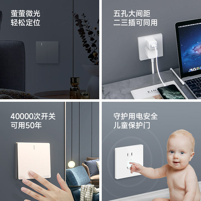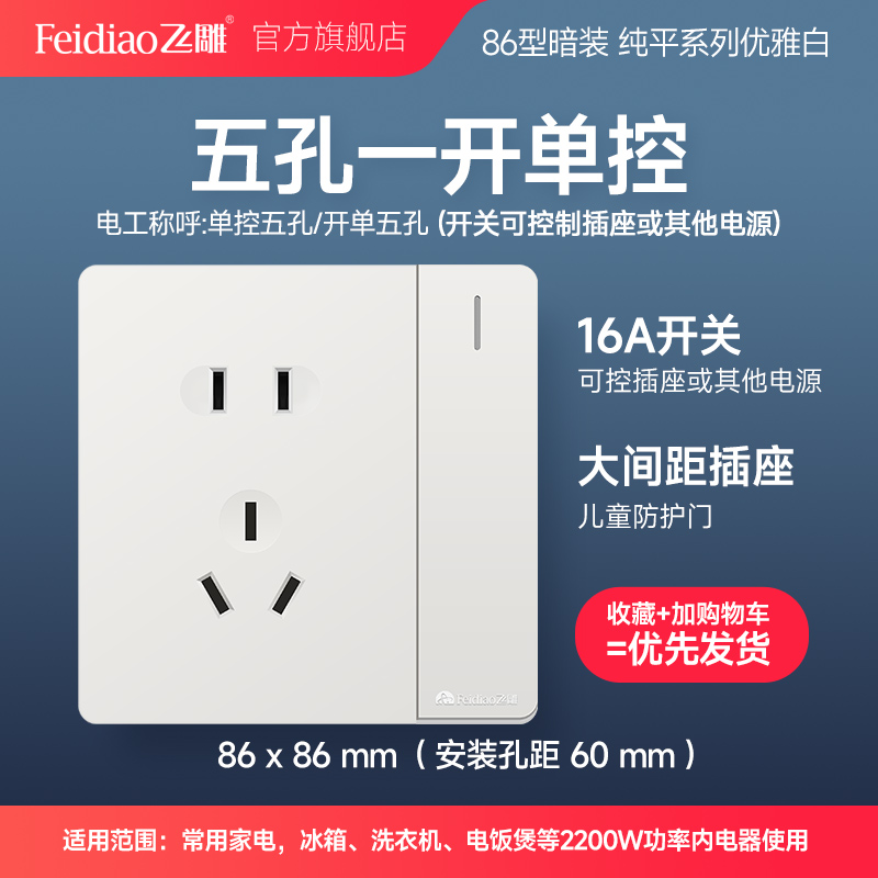 飞雕开关插座面板多孔86型暗装电源一开单带五孔插家用一开五孔