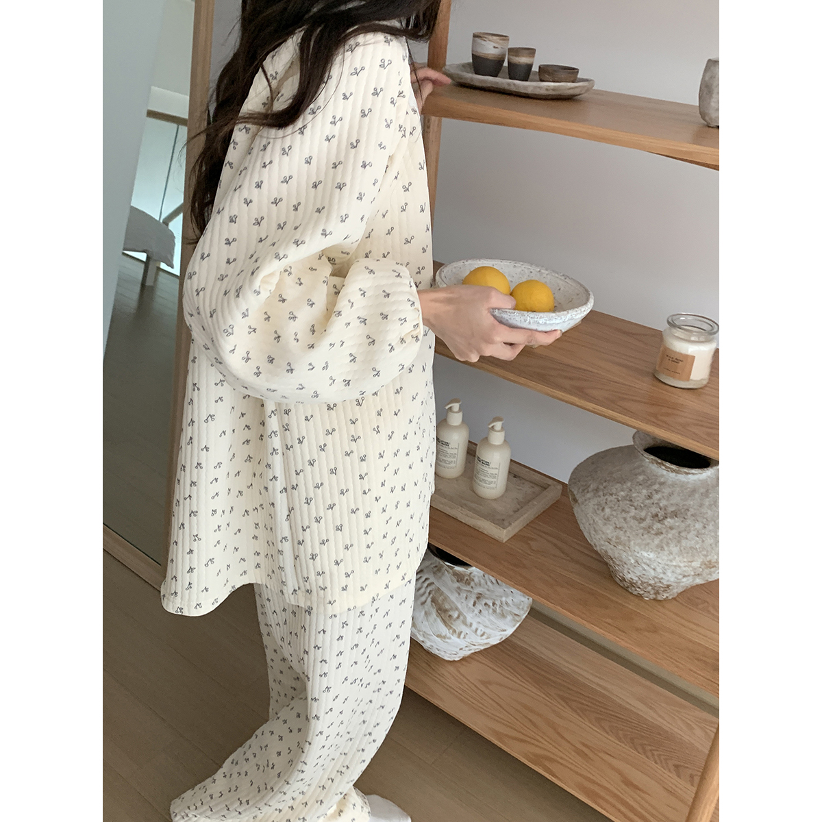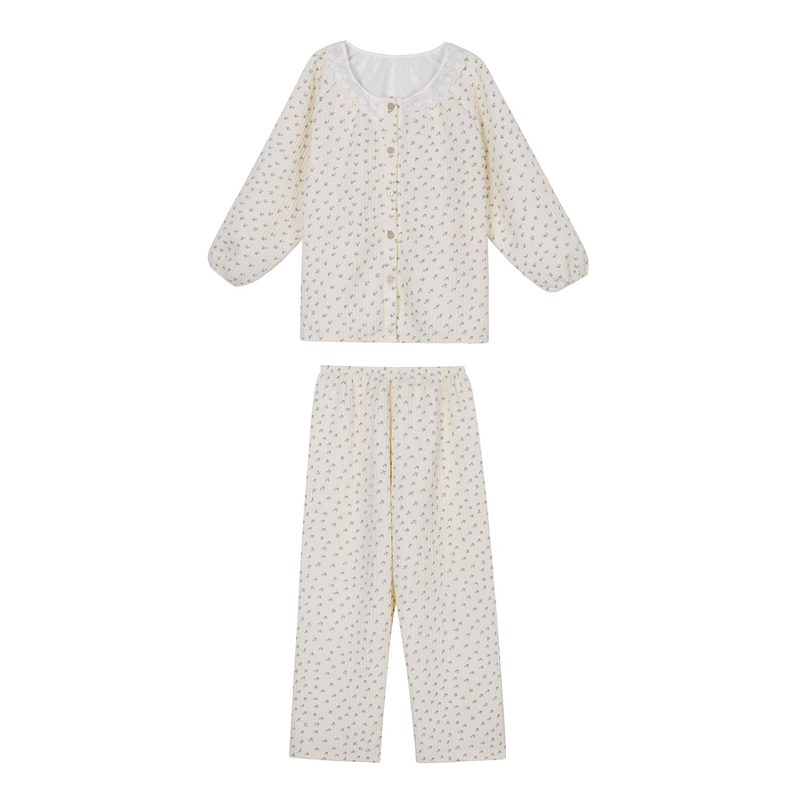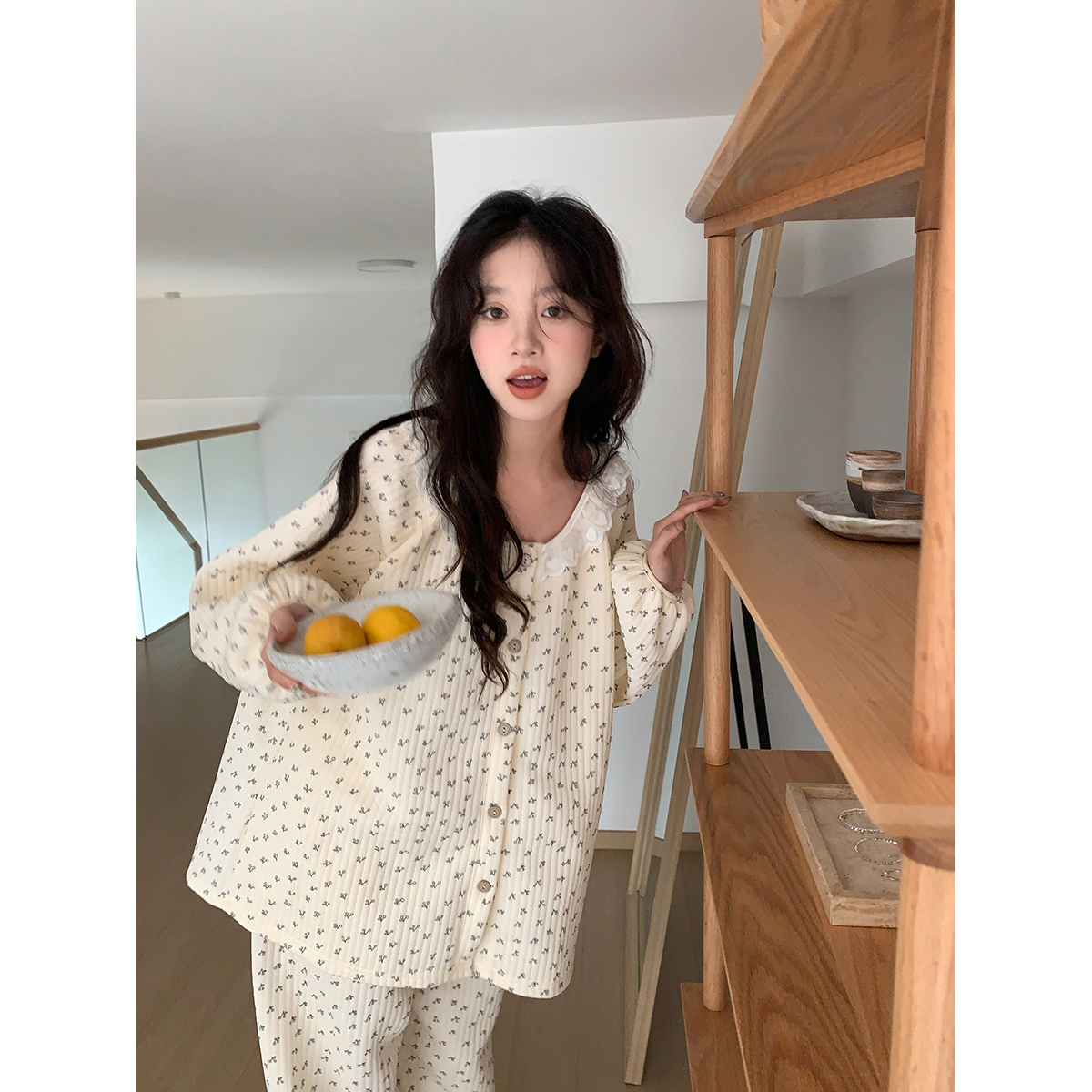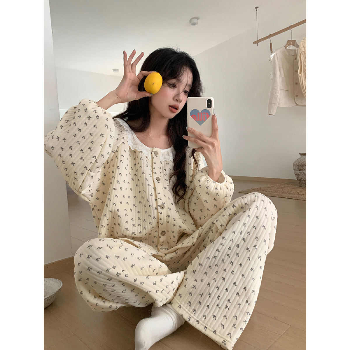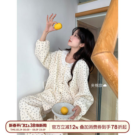 馨帮帮 秋冬新款蕾丝圆领碎花睡衣女套装加厚夹棉保暖家居服套装