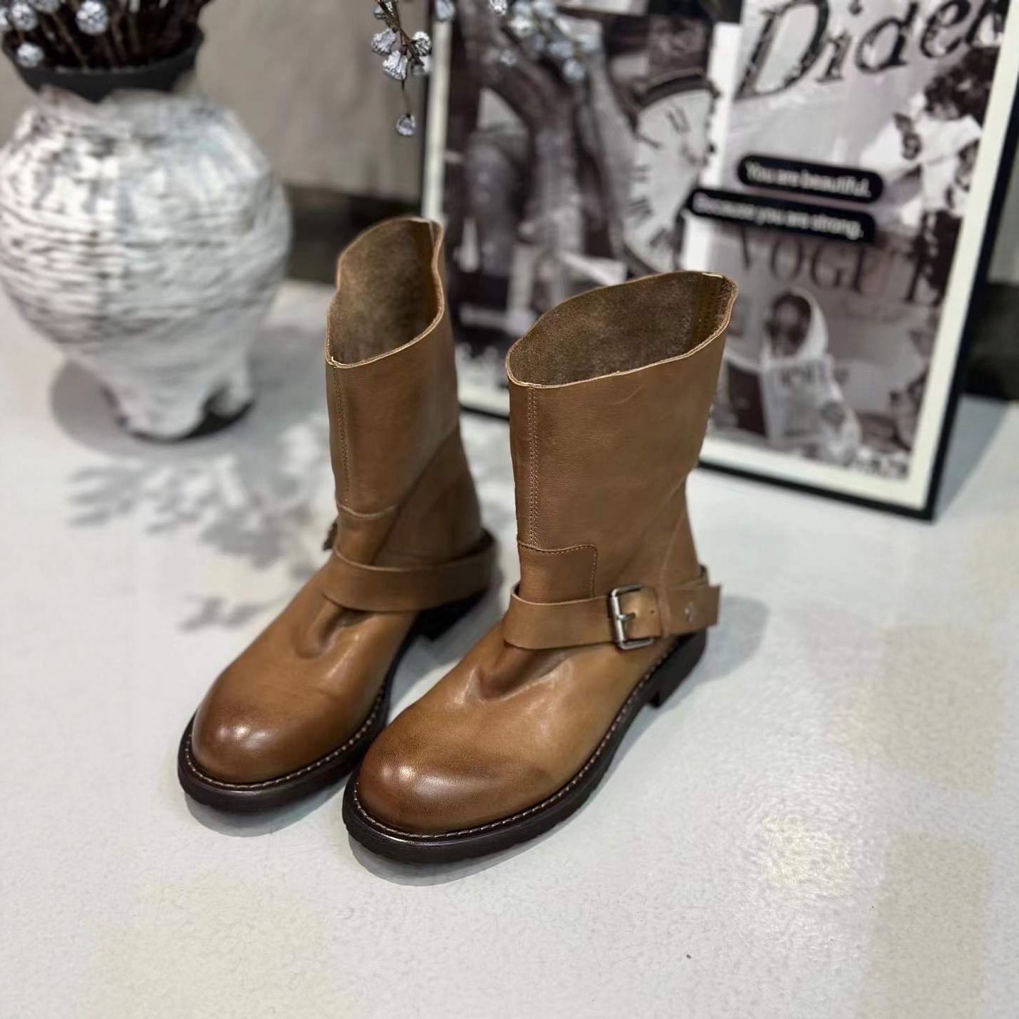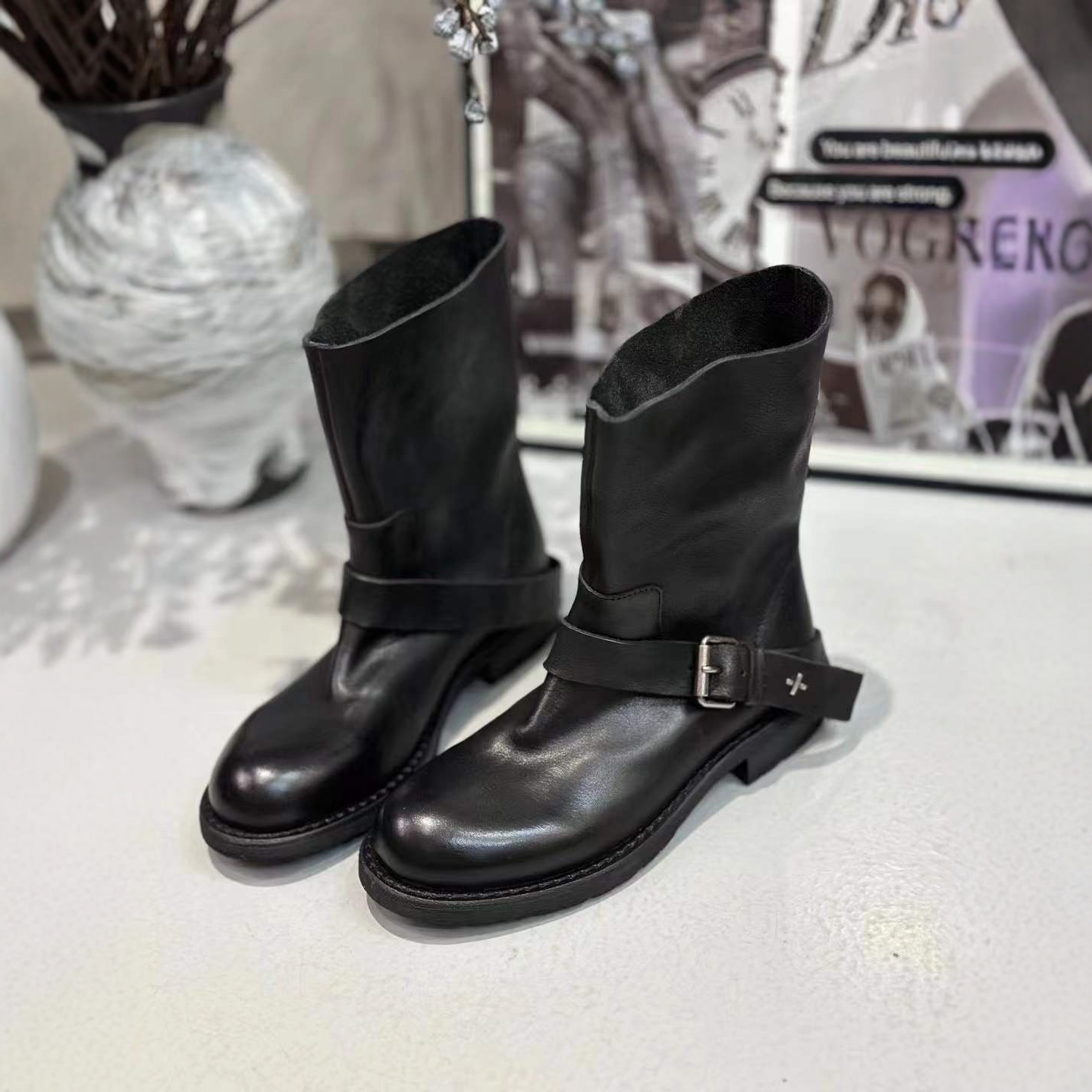 旎彩2025巨好看鞋子靴子软皮一脚蹬中筒靴女平底朋克风潮靴配裙子