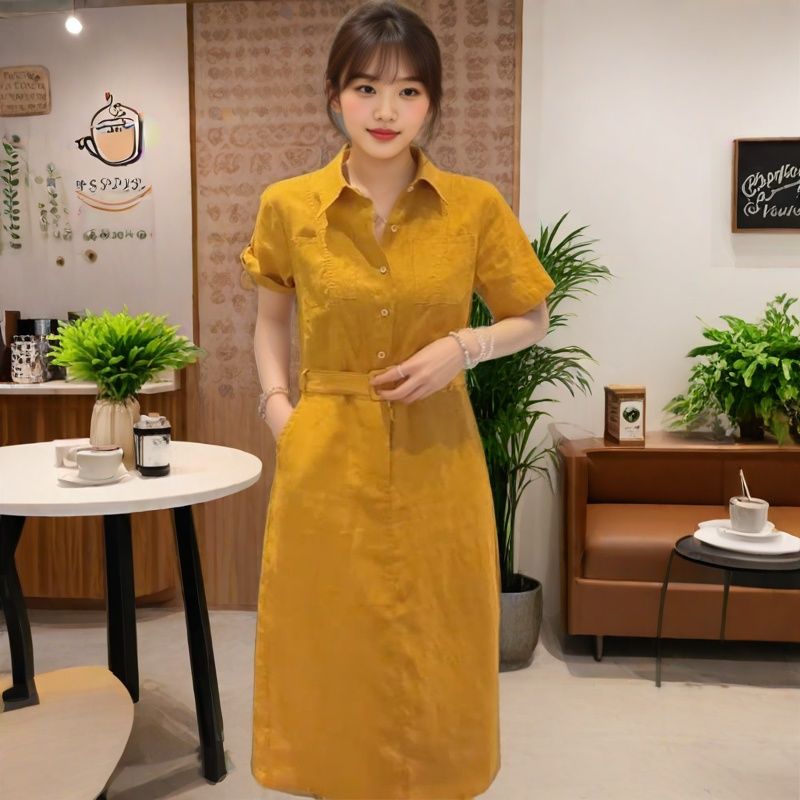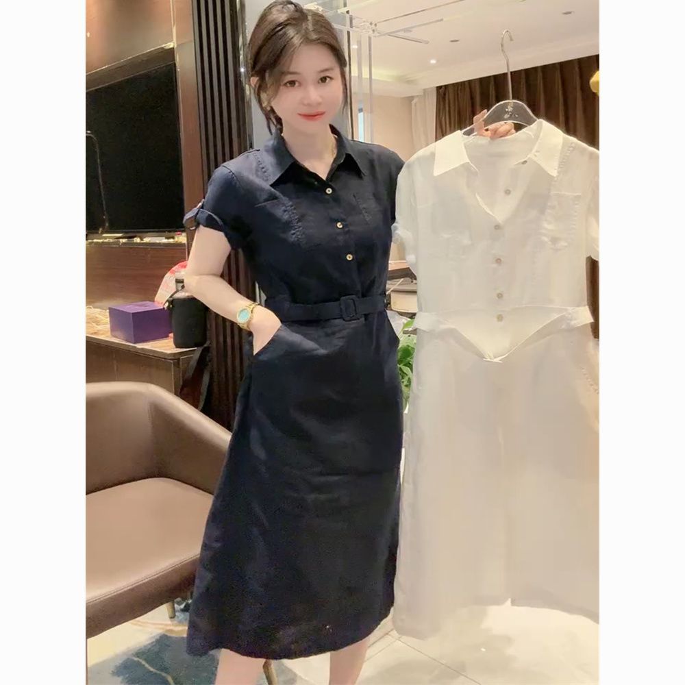 2025夏季网红新款亚麻连衣裙女设计感翻领半排扣收腰显瘦中长麻裙