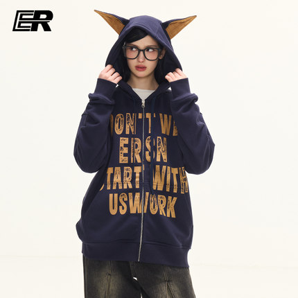 【明星同款】ER斑驳字母印花杜宾犬卫衣开衫小狗耳朵连帽外套