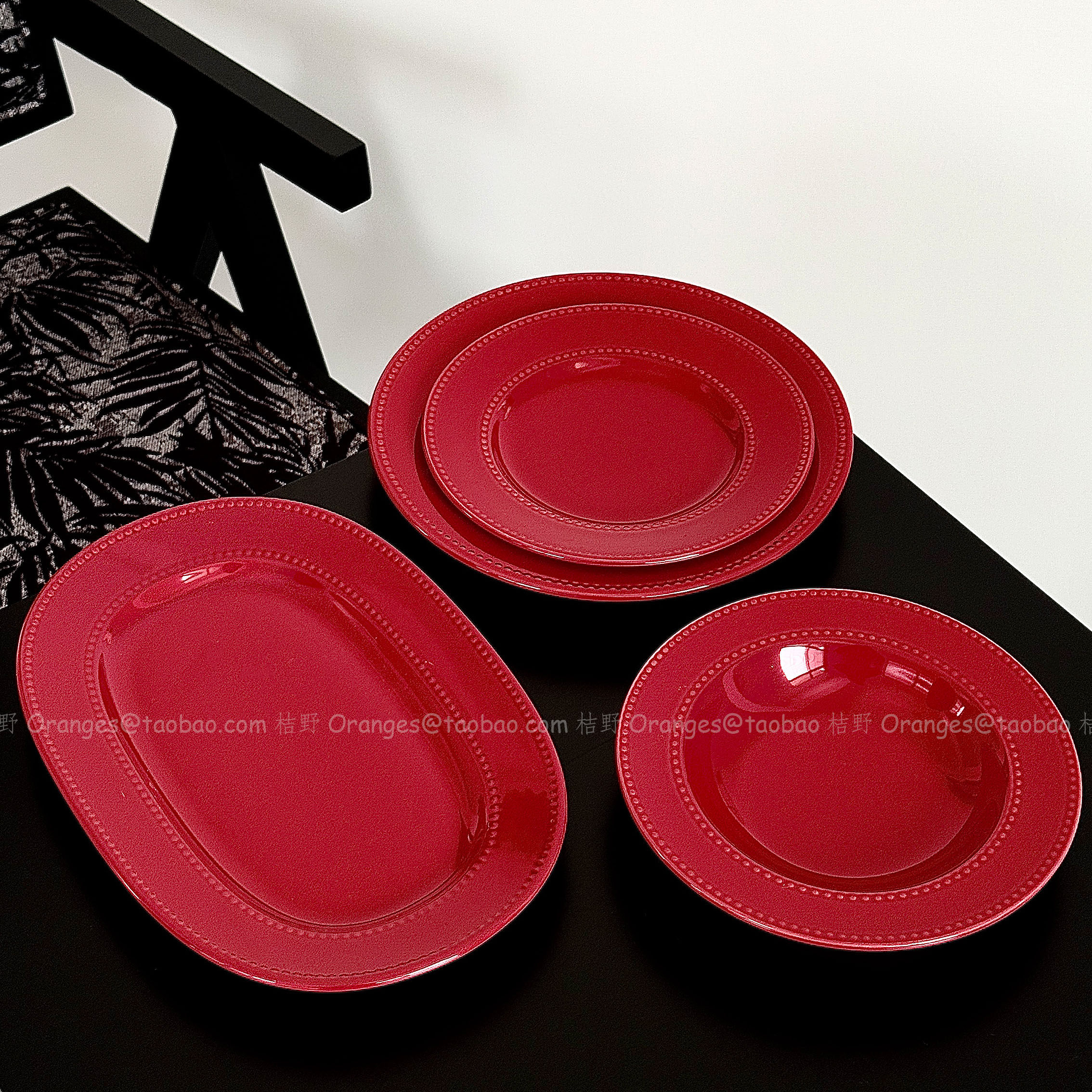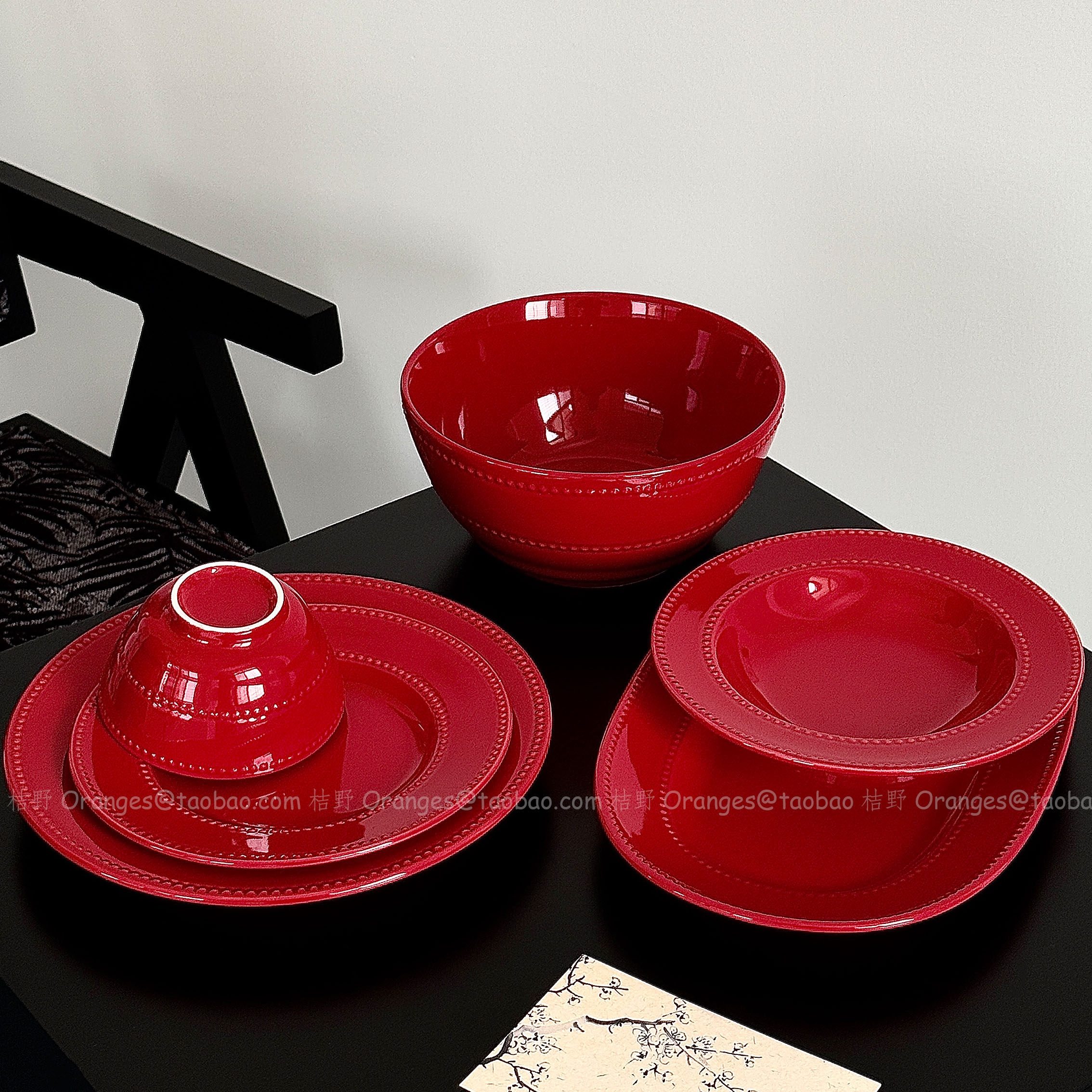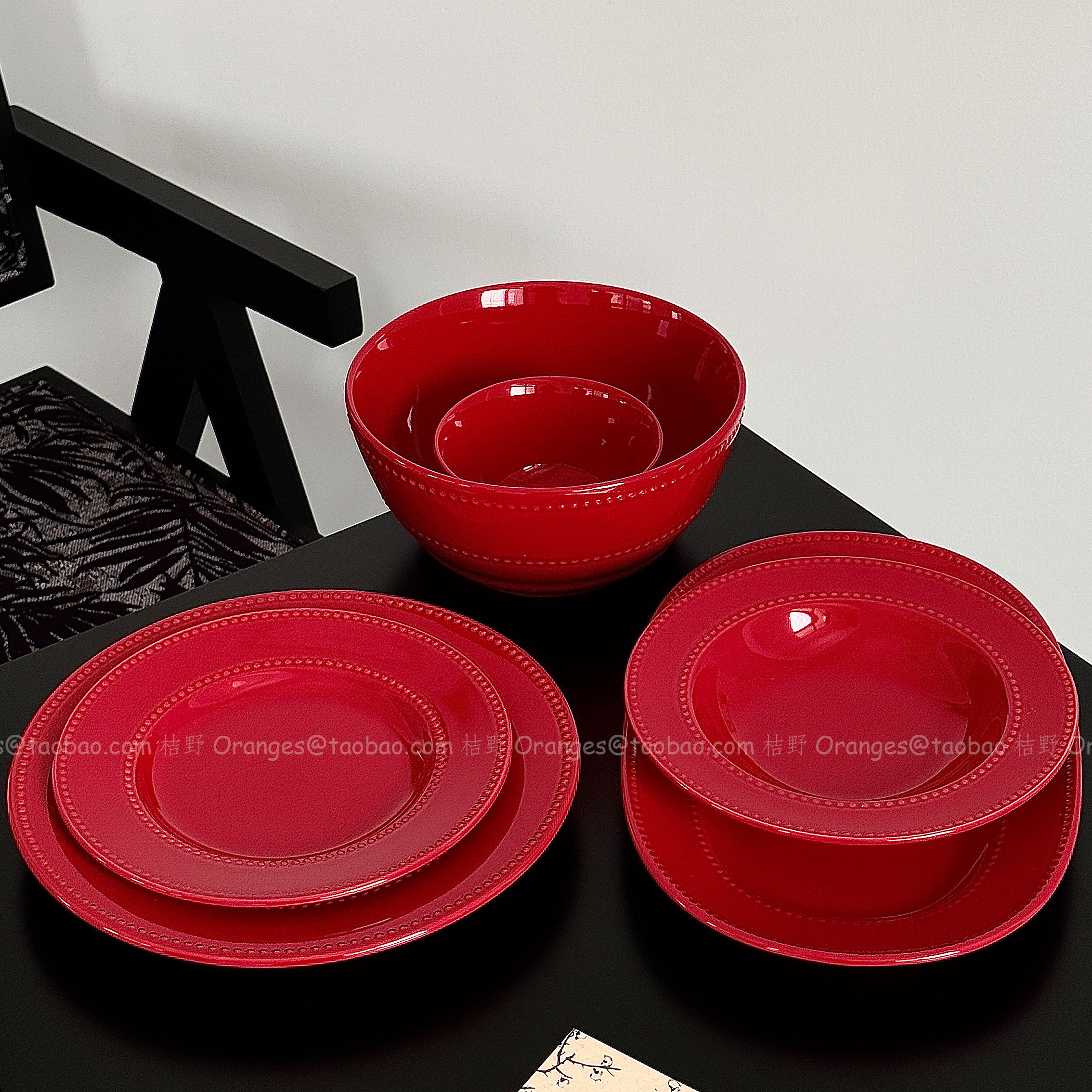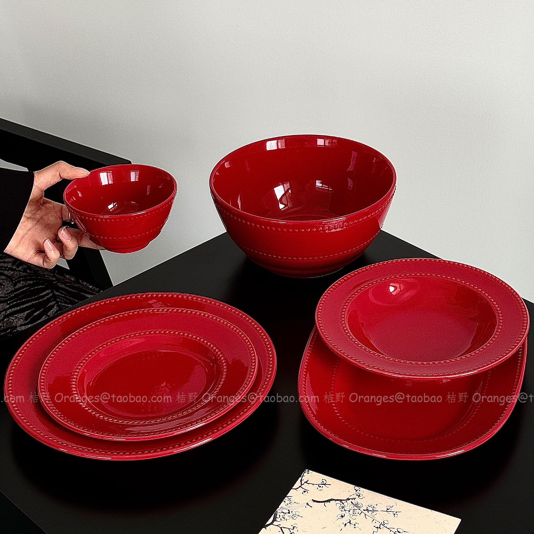 乔迁新居复古红珠点陶瓷餐具套装家用碗碟西餐盘子汤碗饭碗马克杯
