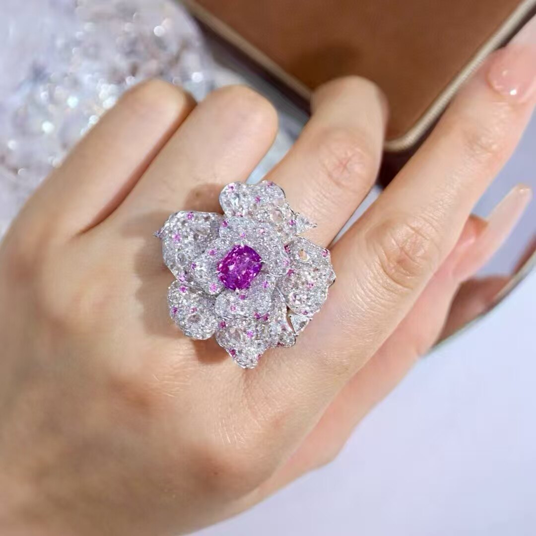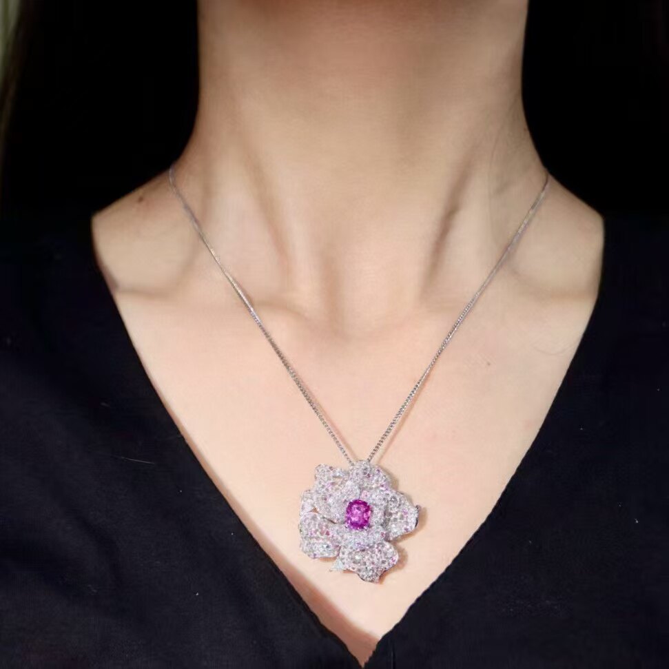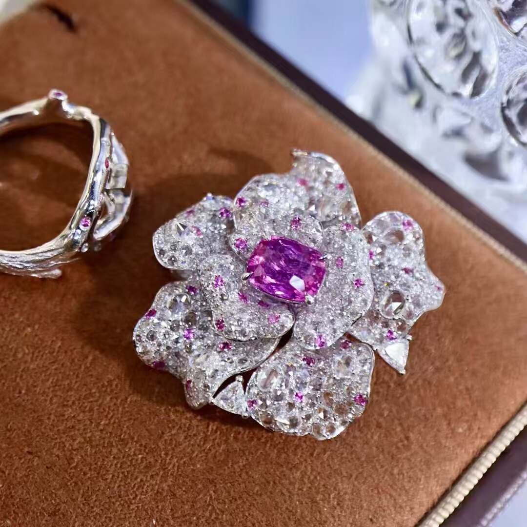18K金钻石彩宝镶嵌 天然无烧帕帕拉恰戒指/吊坠/胸针三用 花朵款