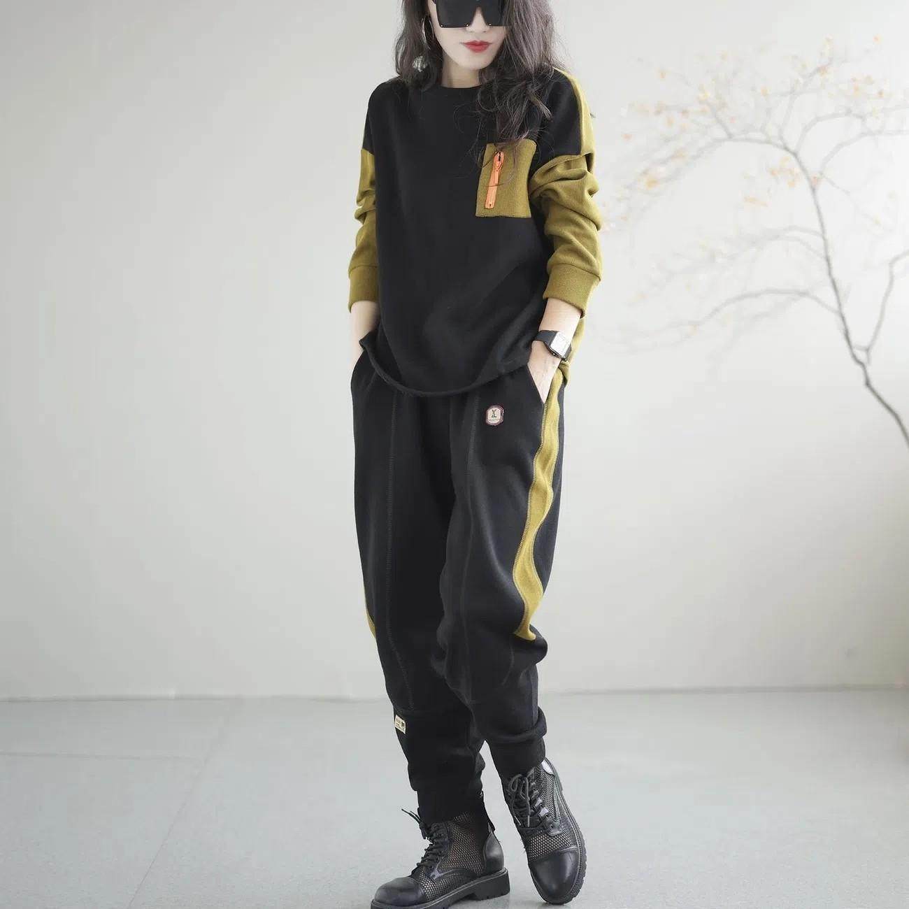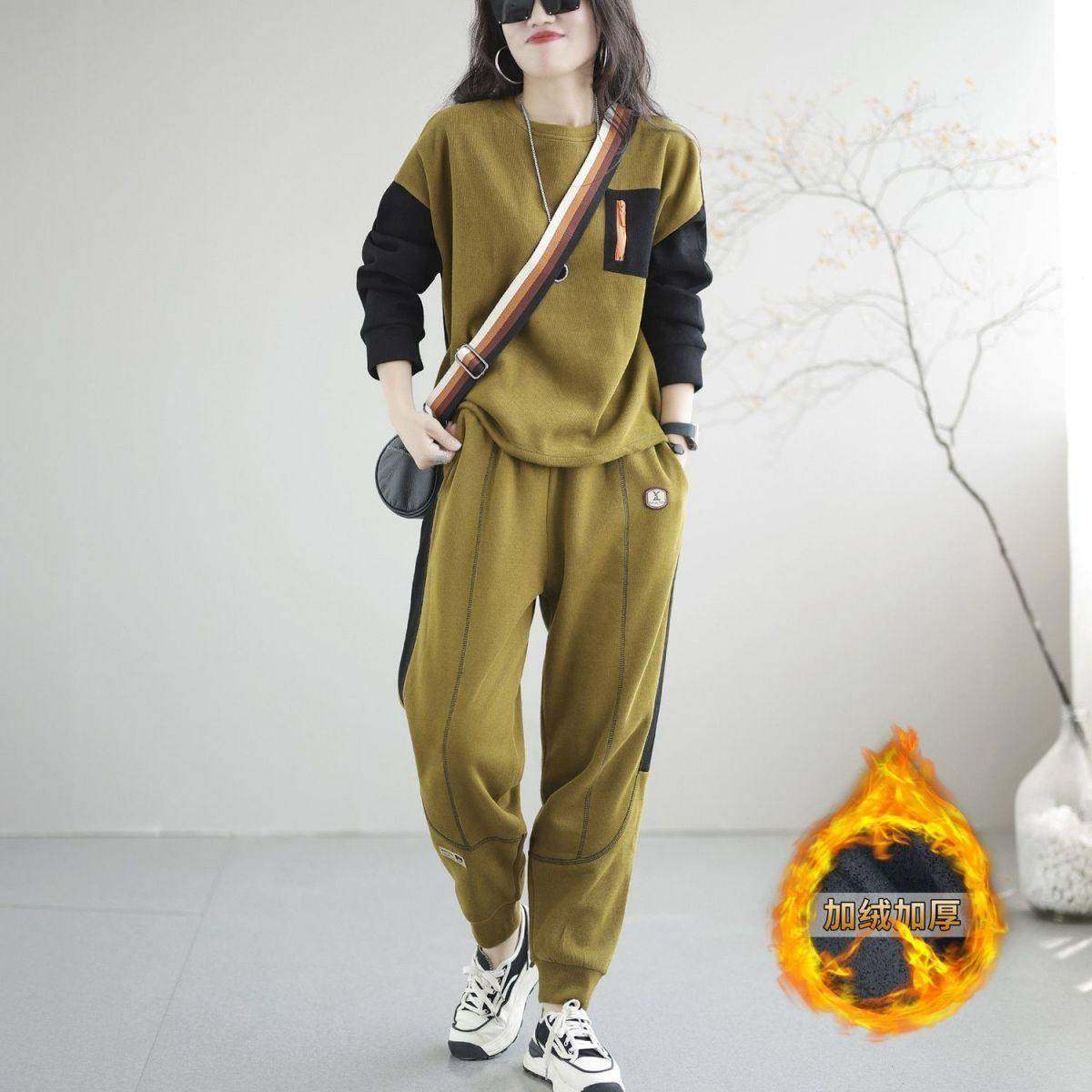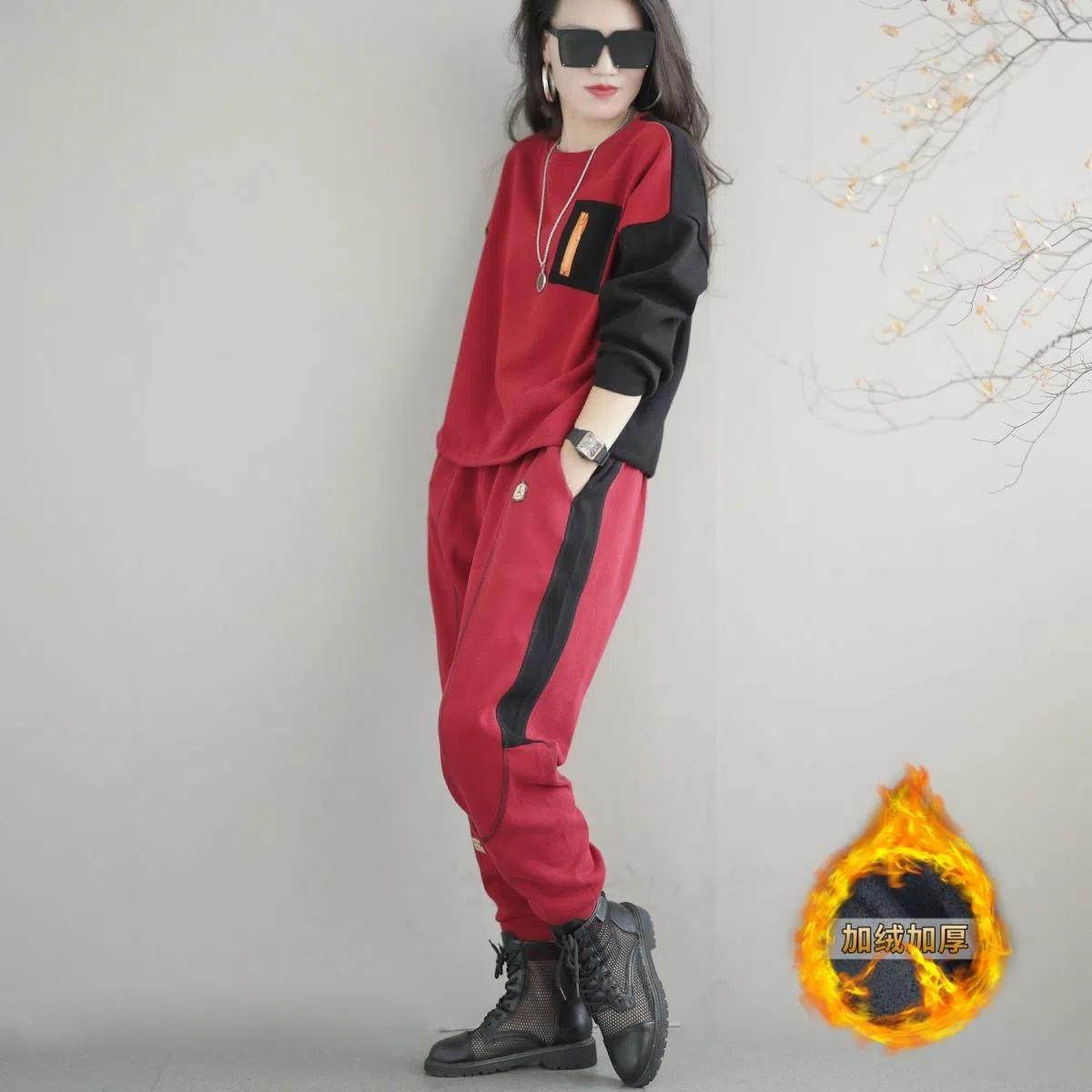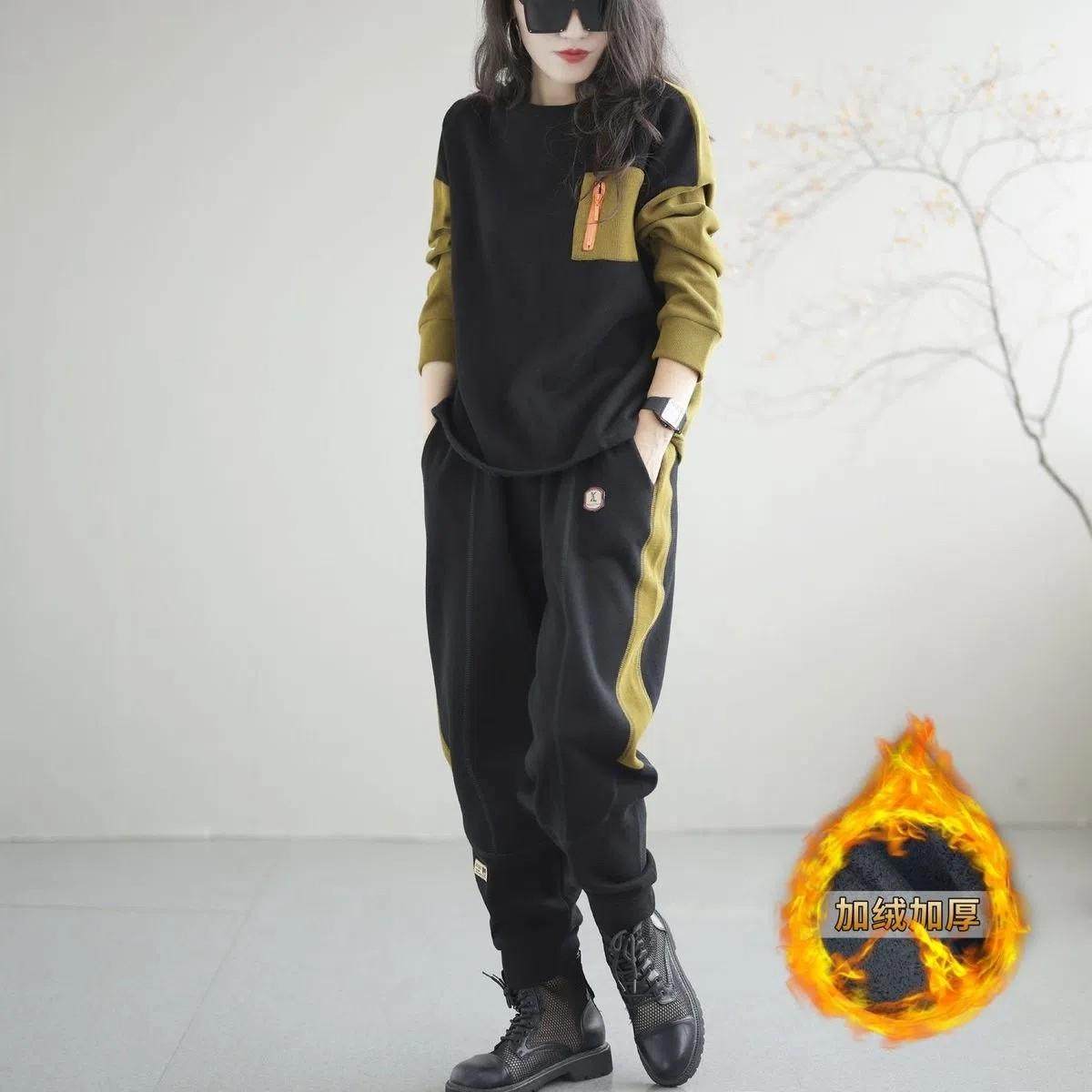 香港大码春秋冬撞色卫衣运动裤套装女胖mm遮肚显瘦加绒加厚两件套