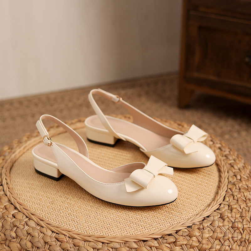 2025新款蝴蝶结圆头粗跟高跟鞋百搭小众包头一字带凉鞋女后空单鞋