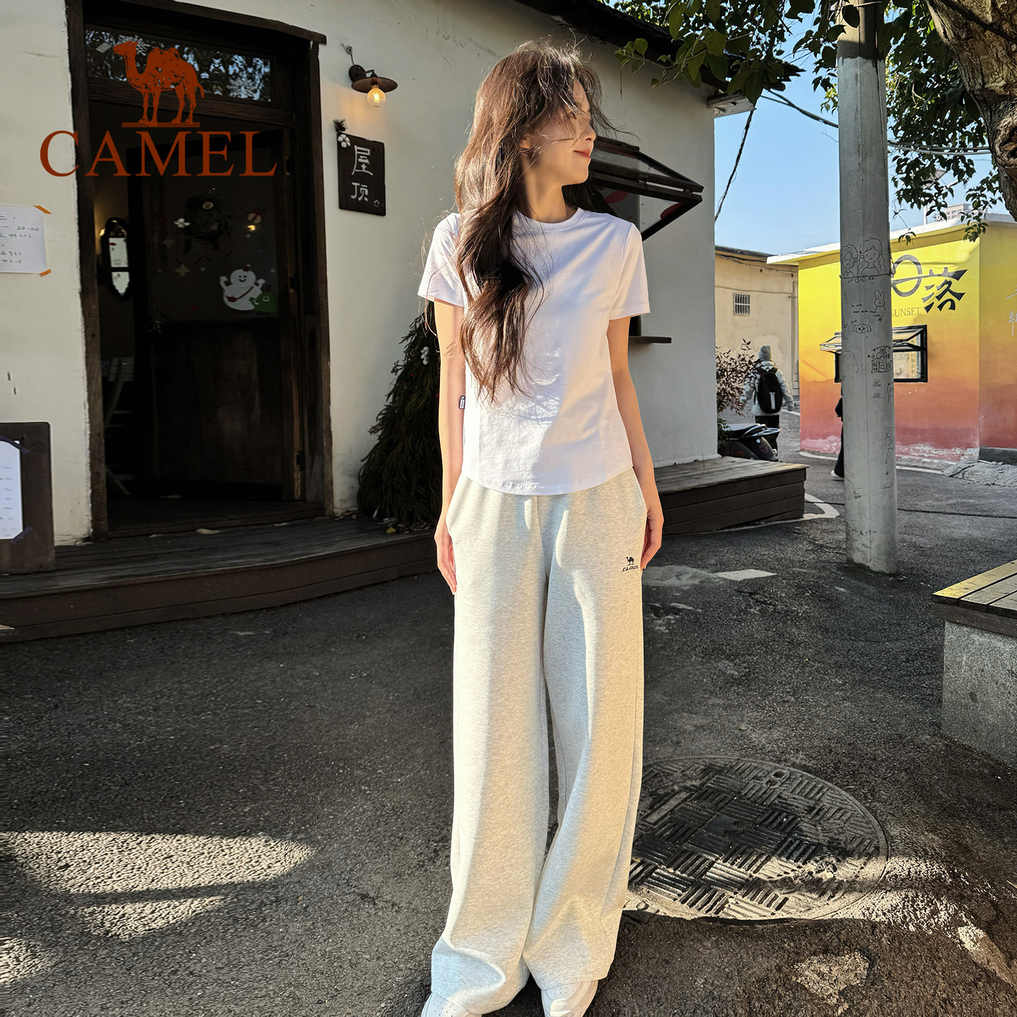 骆驼漫游运动裤女长裤子香蕉阔腿裤直筒休闲针织棉感宽松弯刀卫裤