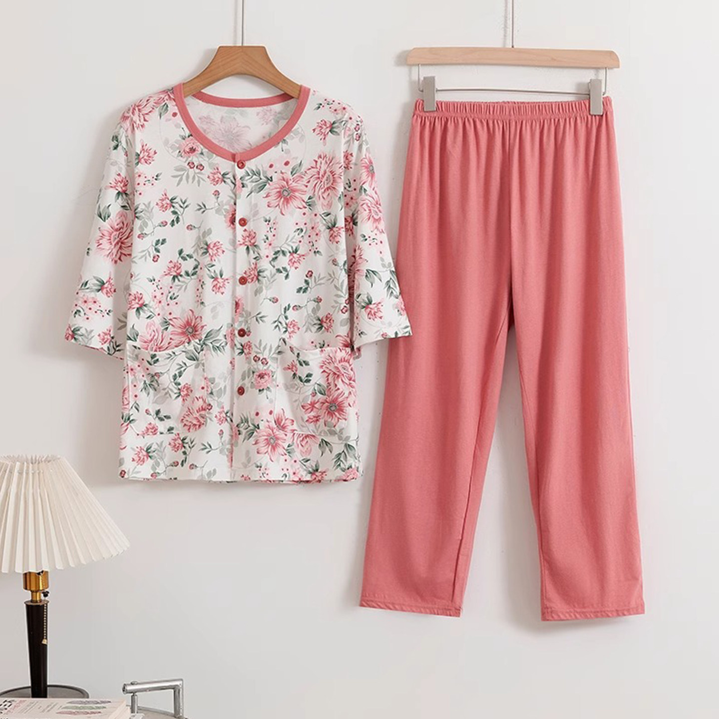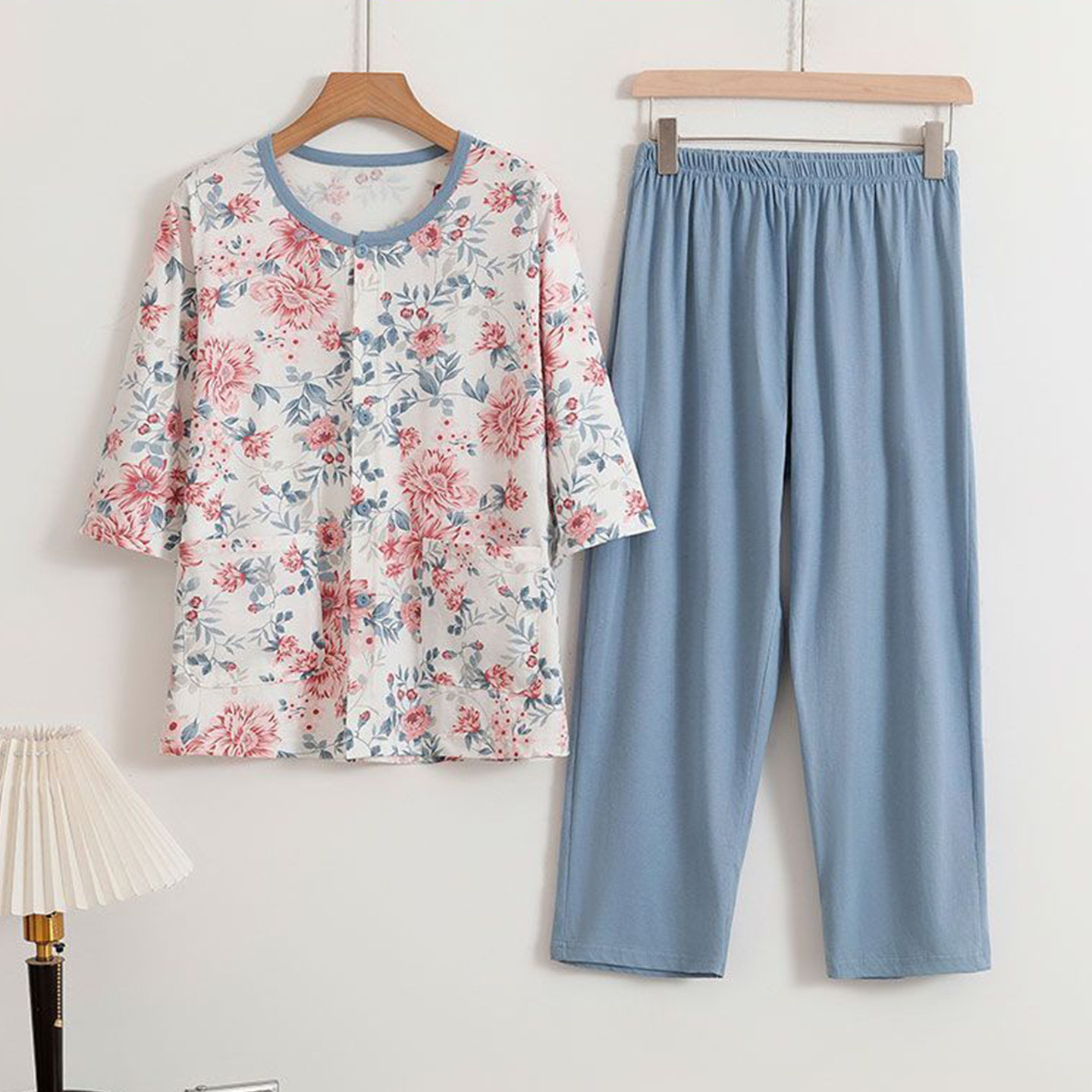 中老年全棉开衫睡衣女纯棉夏季薄款妈妈中袖老太太家居服两件套装