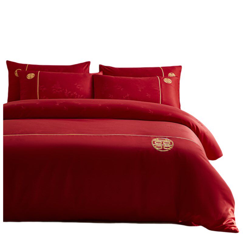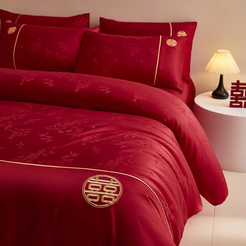 新中式竹子提花婚庆四件套红色被套喜庆床单结婚床上用品陪嫁
