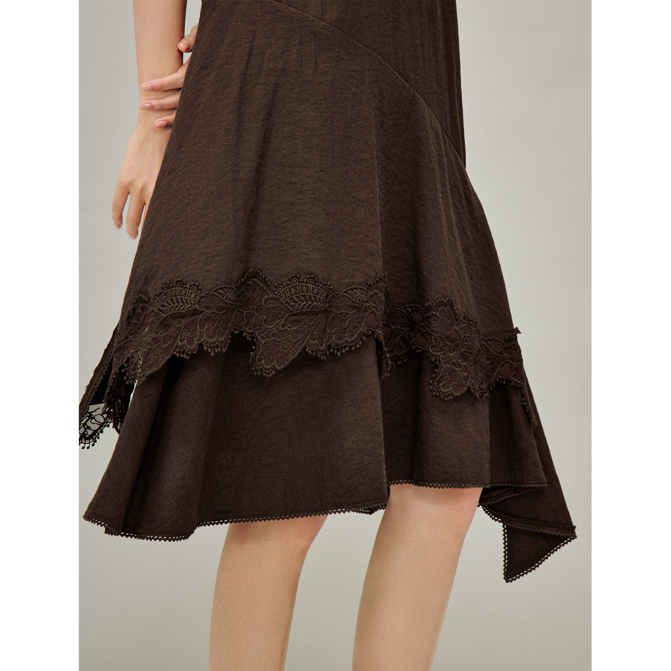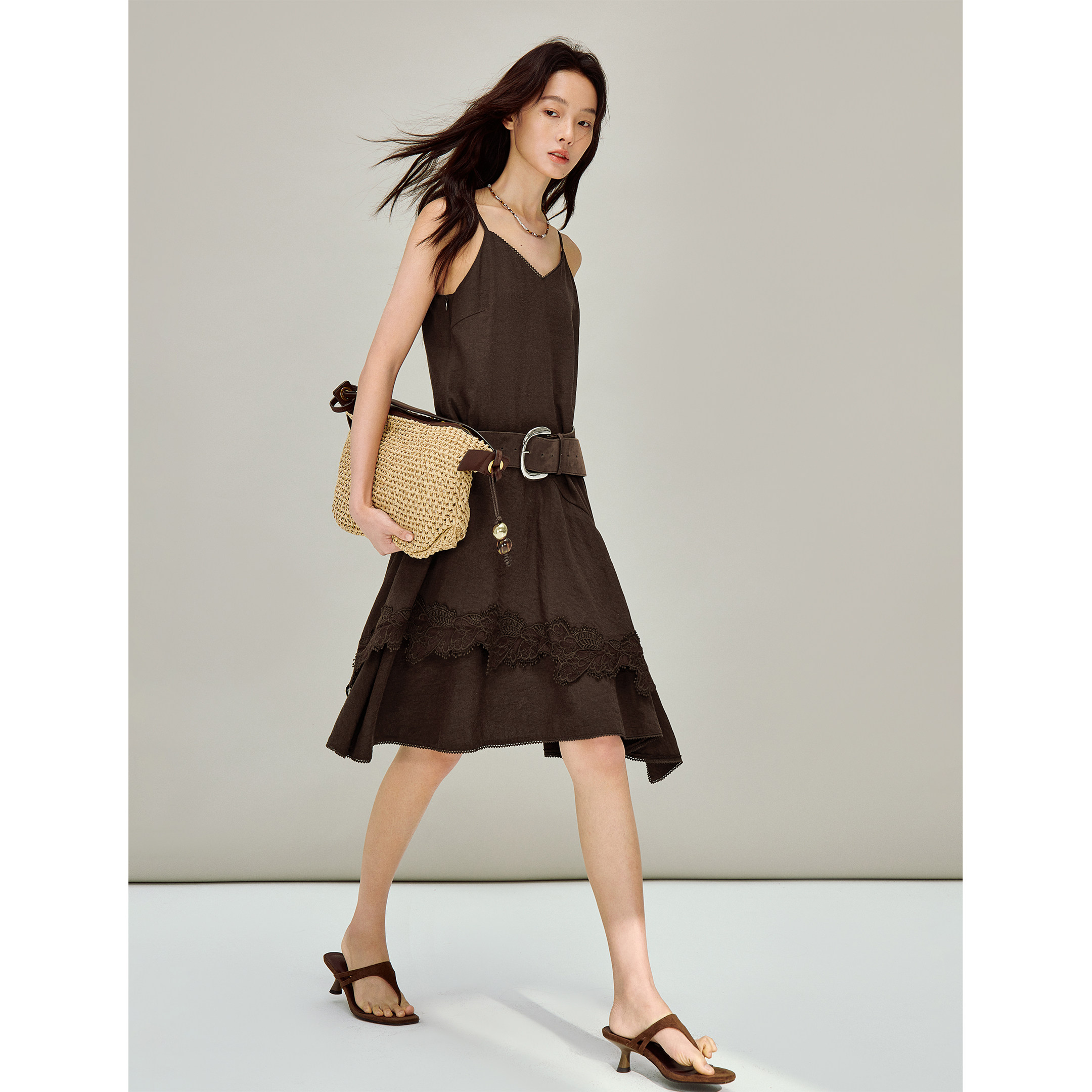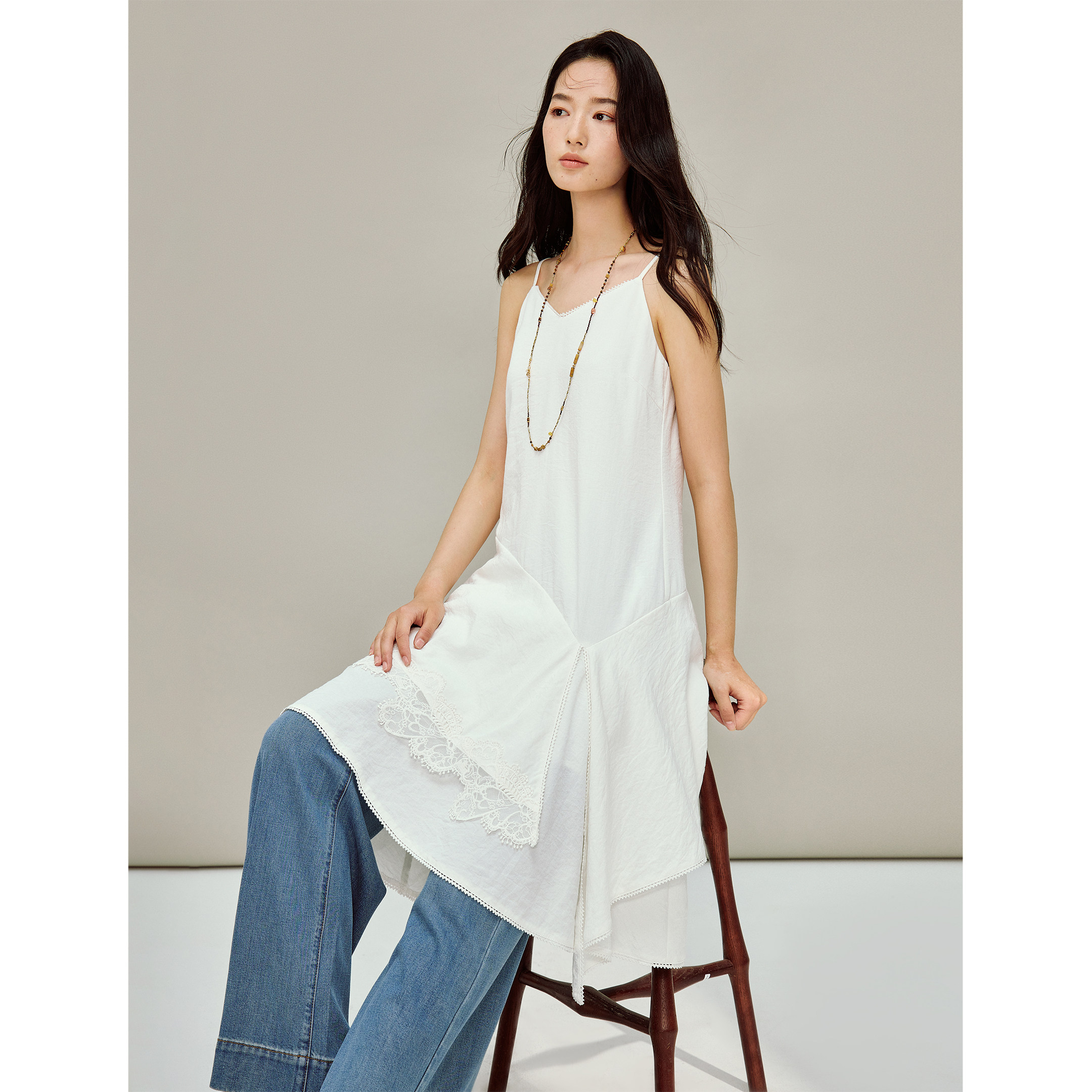 茵曼不规则蕾丝花边吊带连衣裙2026春季女装新款砂洗宽松中长裙
