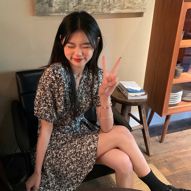 现货速发复古碎花系带V领长袖连衣裙春季2024新款不规则收腰休闲