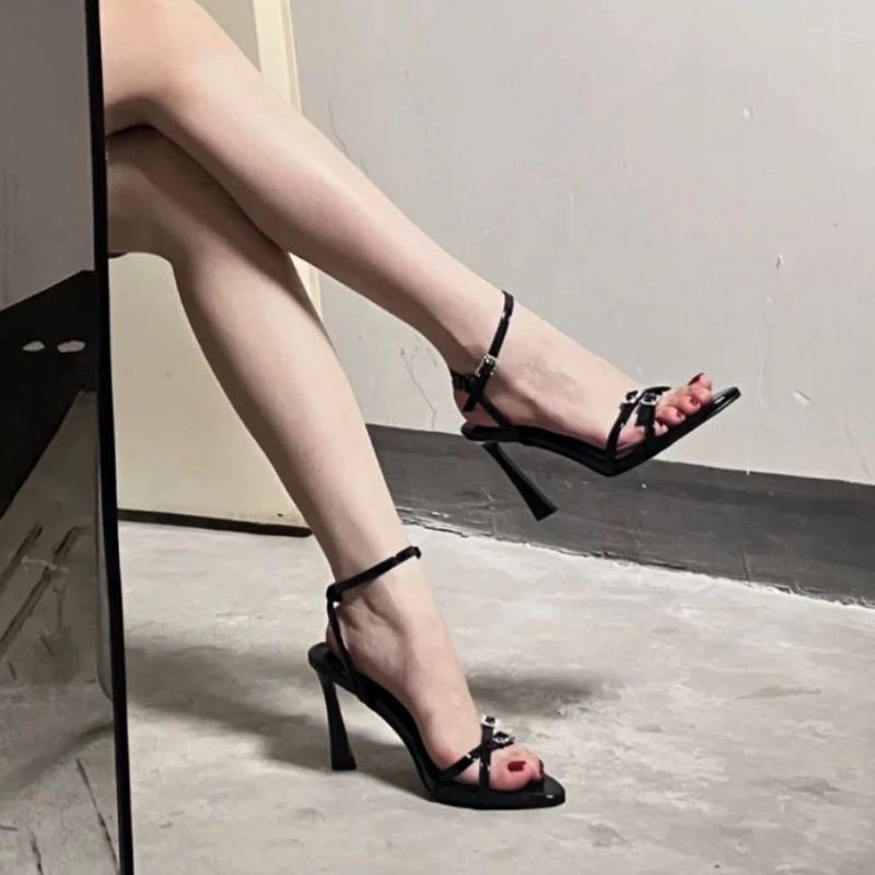 2025年夏新款细带露脚趾一字带扣凉鞋女尖头细跟宴会红色高跟鞋女