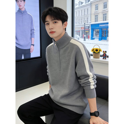 半高领拉链男士厚款加绒毛衣青少年套头针织衫可外穿加厚保暖线衣