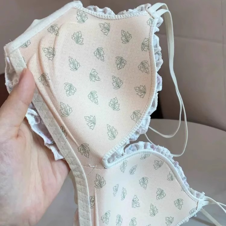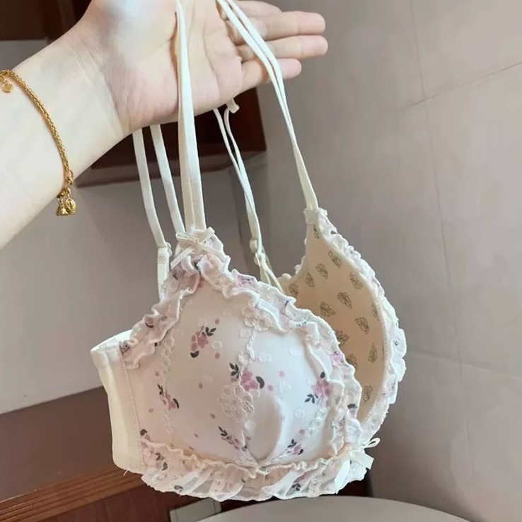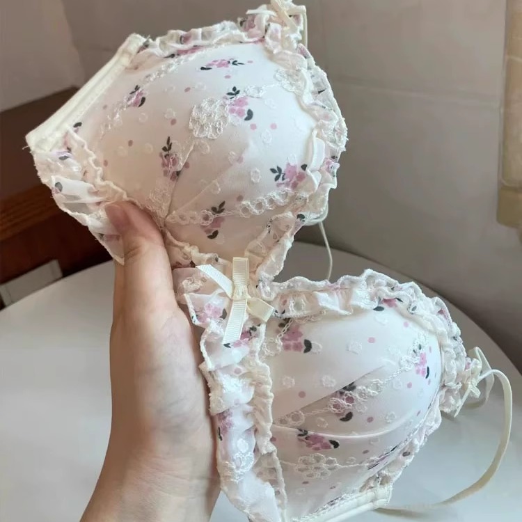 日系甜美碎花内衣女小胸聚拢无钢圈夏季薄款纯欲风蕾丝文胸罩套装