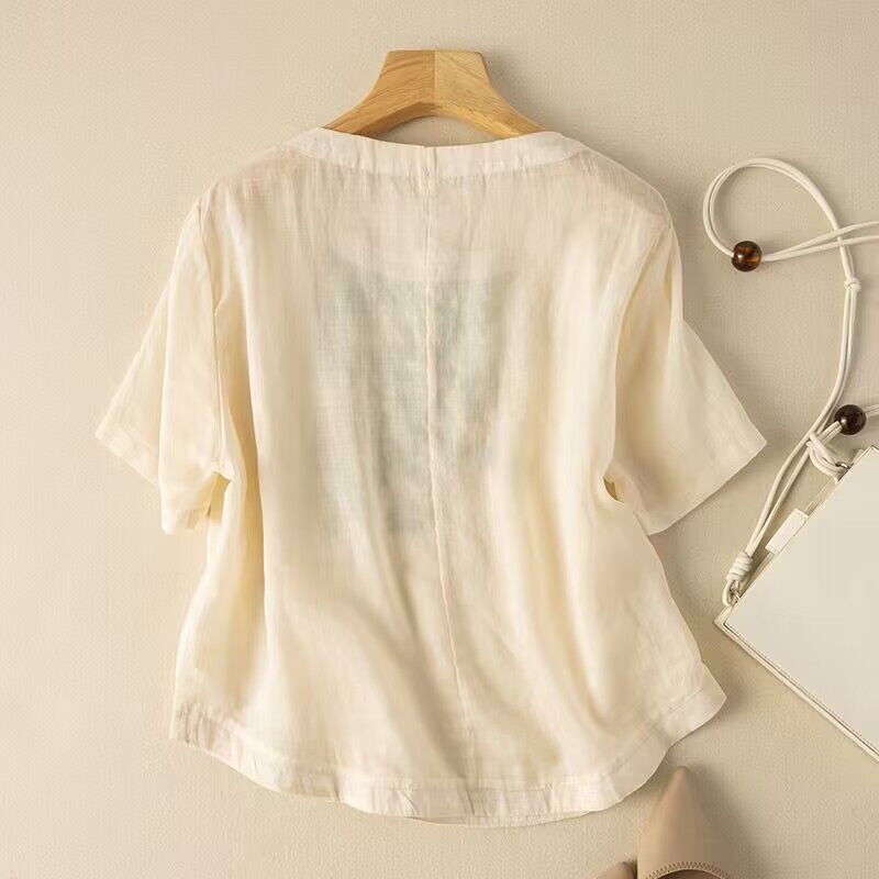 夏季新款女重工精美减龄刺绣棉麻上衣文艺复古宽松高级感短袖T恤