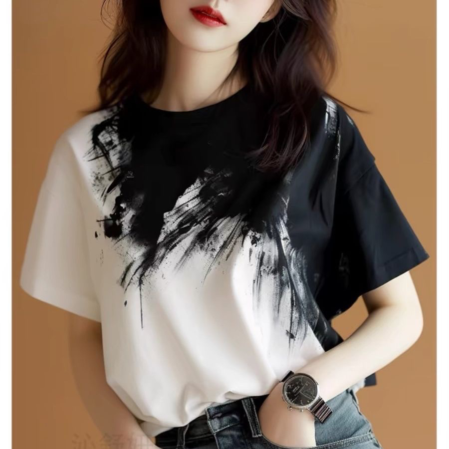 25年新中式国风黑白撞色水墨晕染女T恤短袖上衣奢华大码渐变200斤