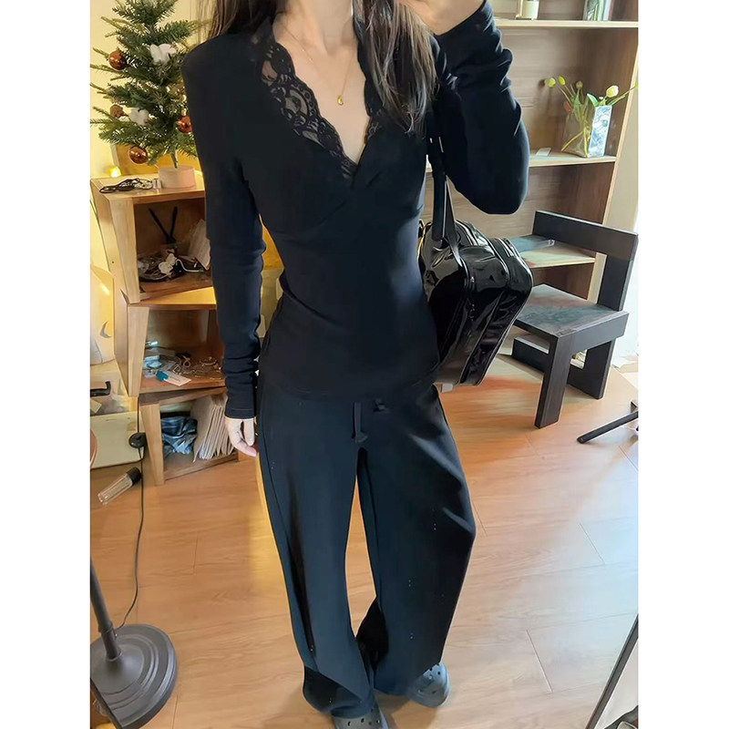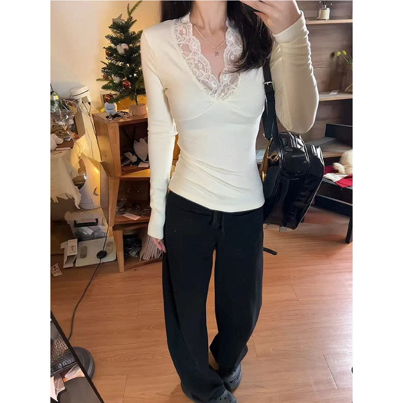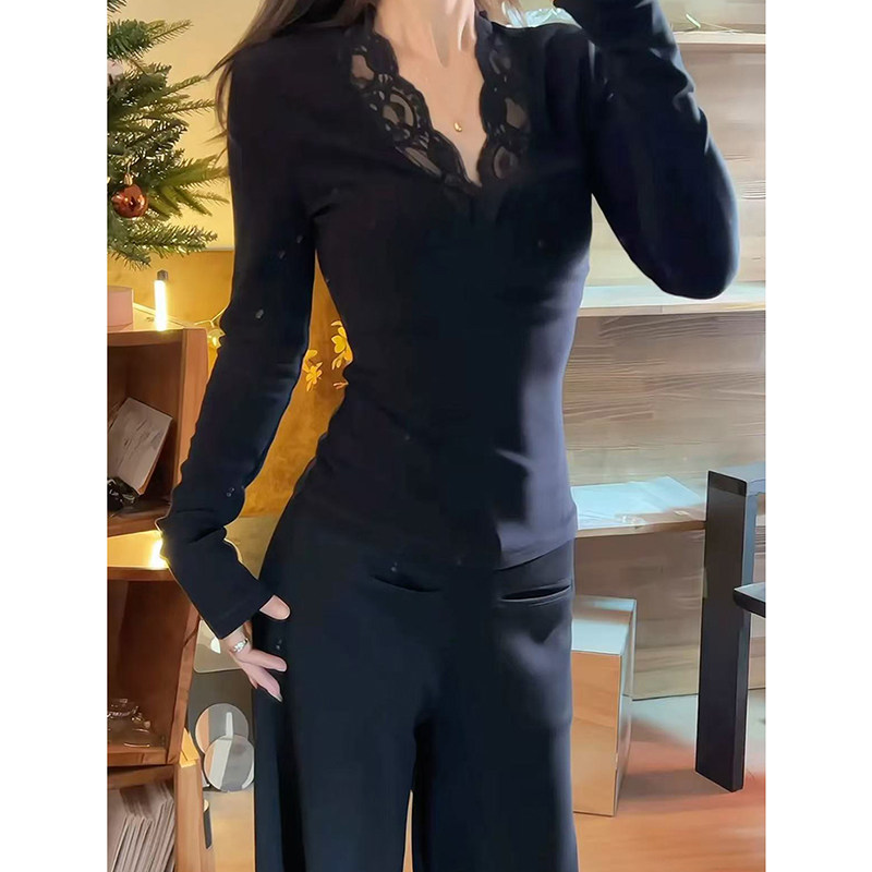 MosesQueen魔西女王加绒加厚蕾丝v领长袖女冬内搭修身打底衫上衣