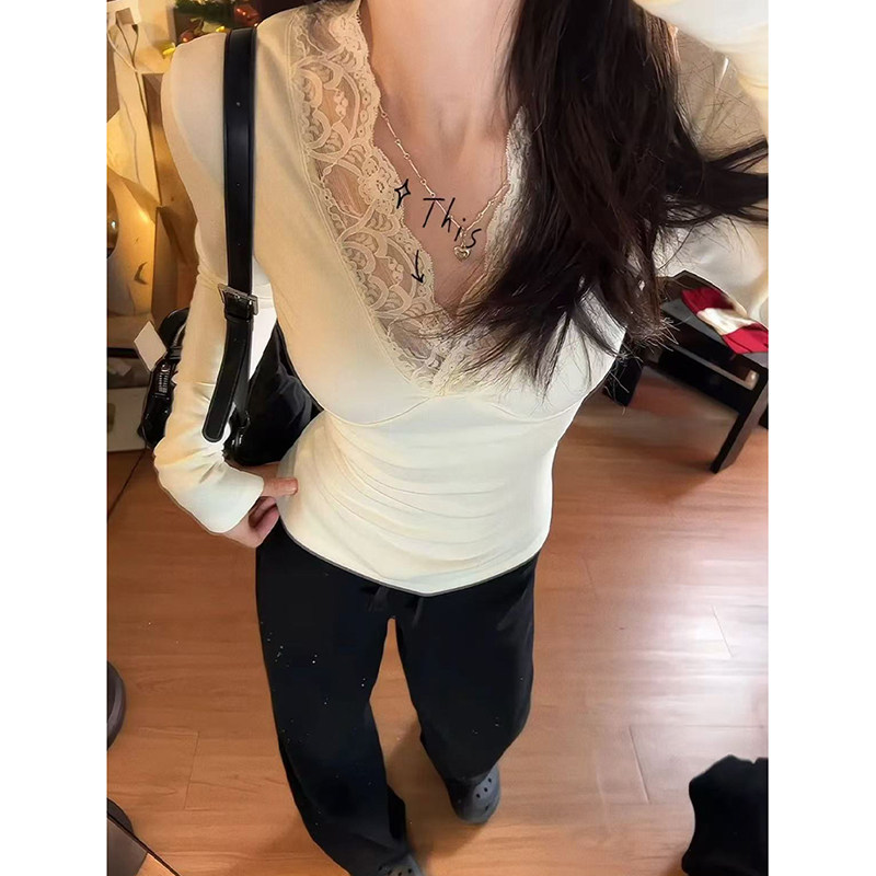 加绒加厚蕾丝v领打底衫内搭上衣