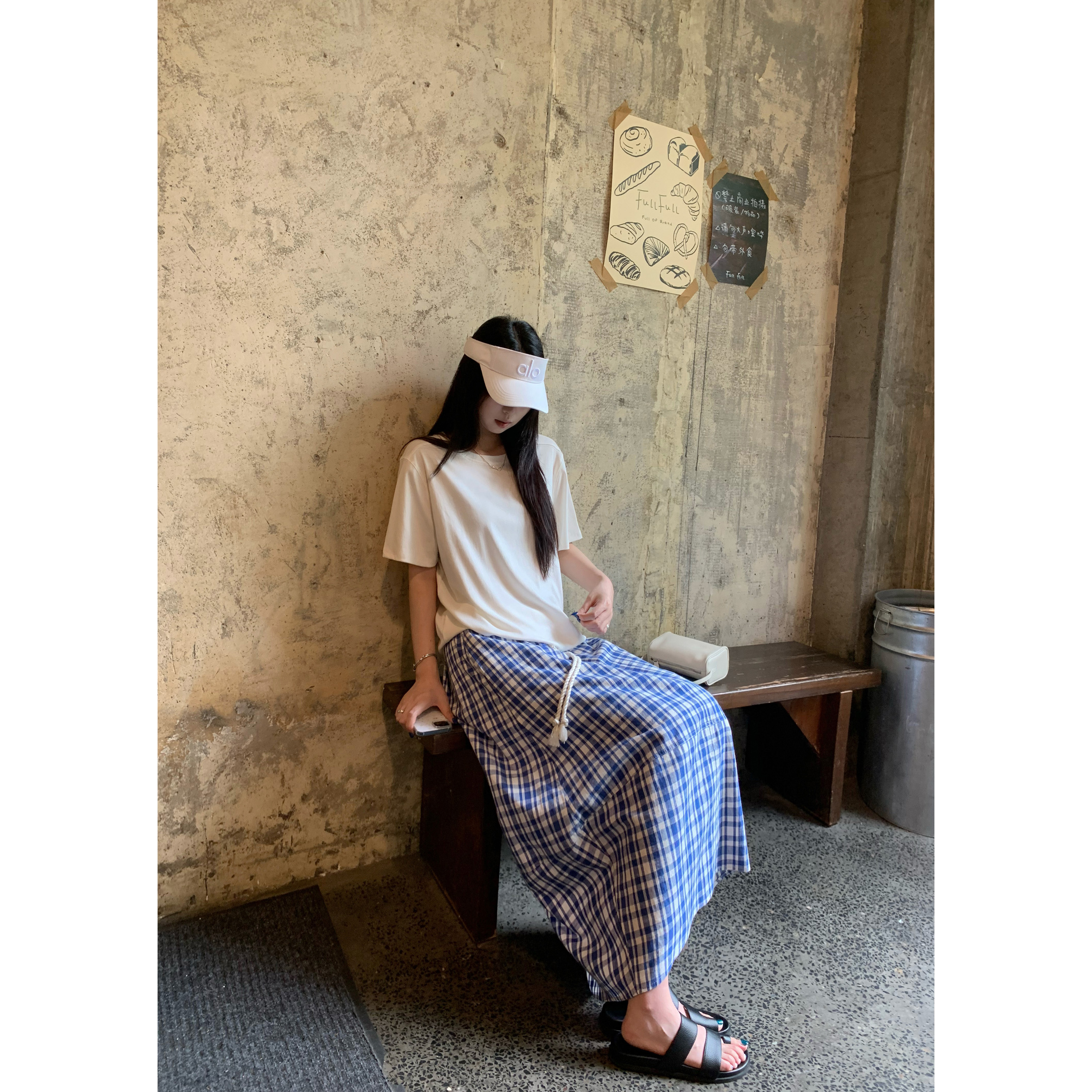 复古蓝白撞色假日休闲格纹半身裙