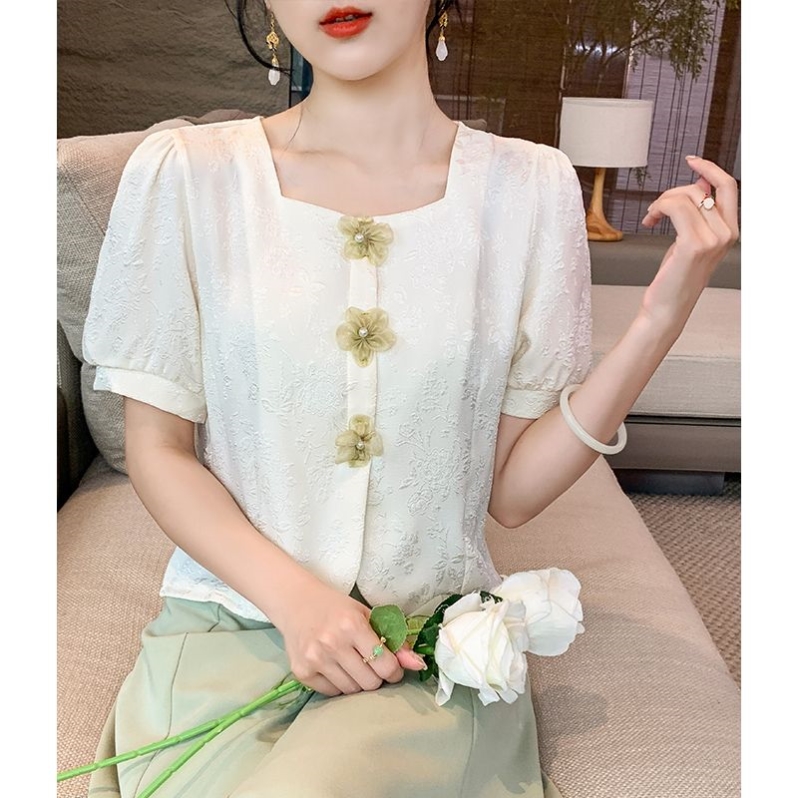 小香风泡泡袖衬衫女2024夏季时尚纽扣方领百搭高腰显瘦短袖上衣