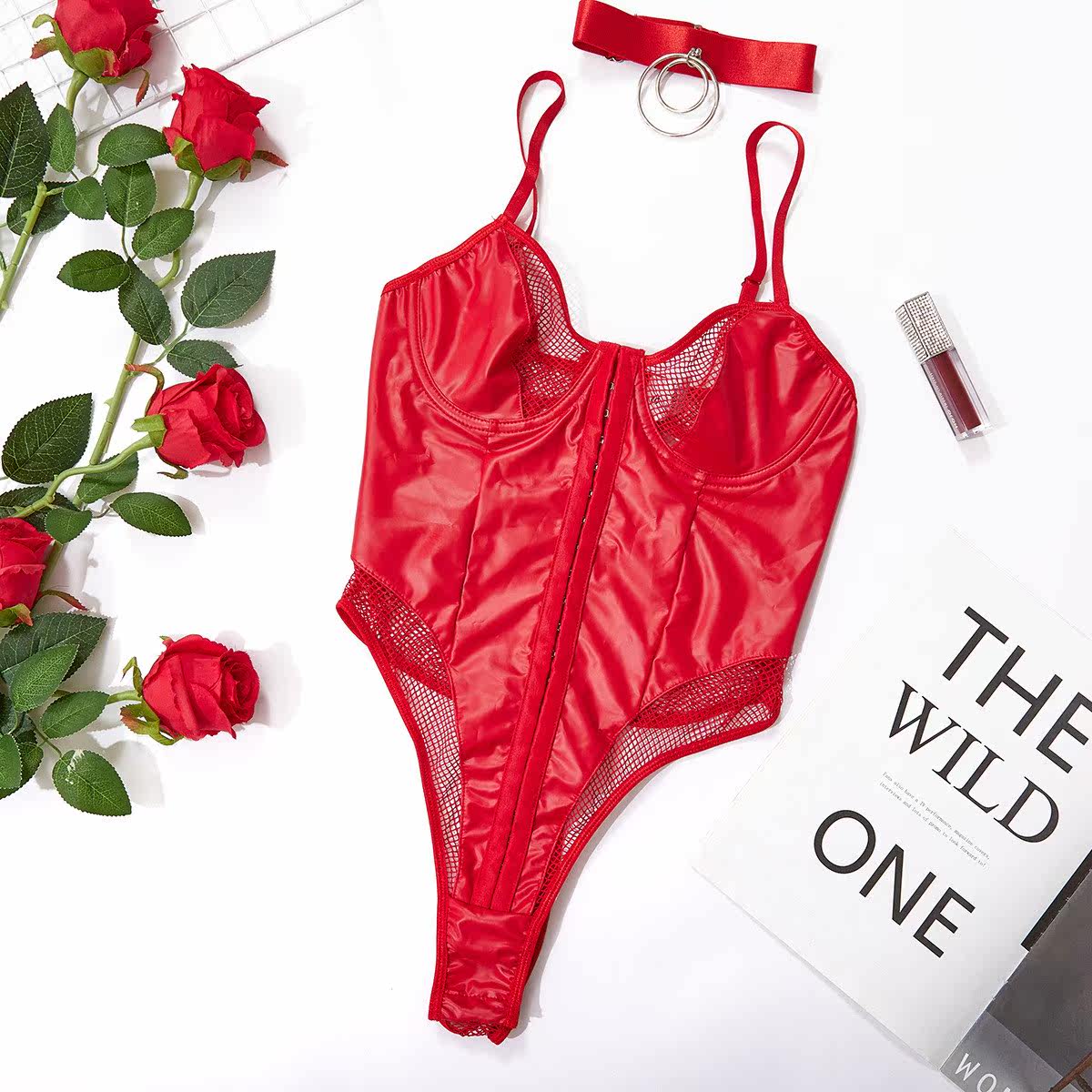 欧美风ins网红夜店性感网纱拼接仿皮拼接镂空紧身连体衣吊带背心