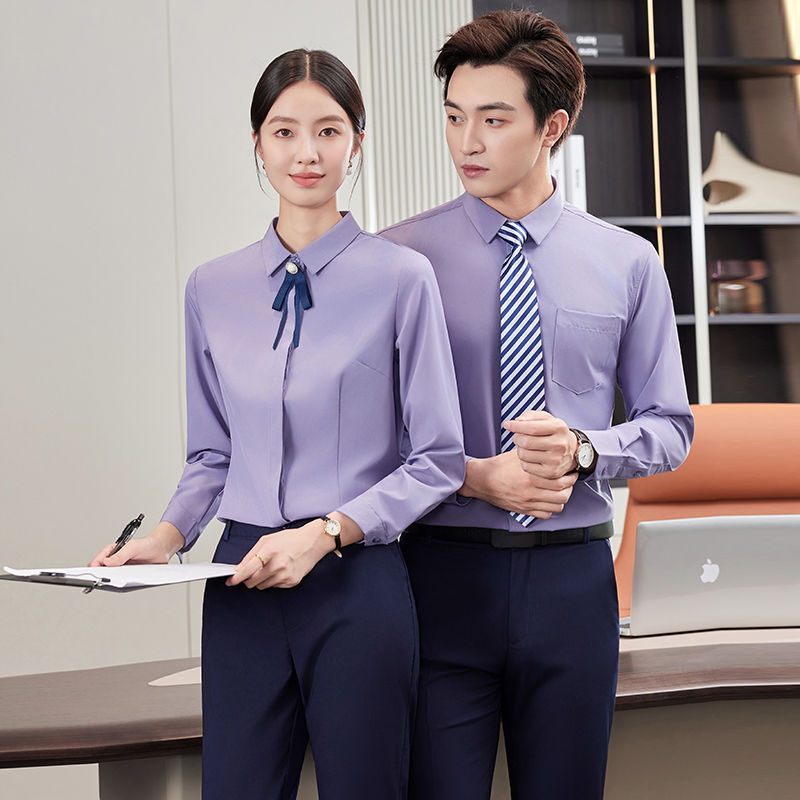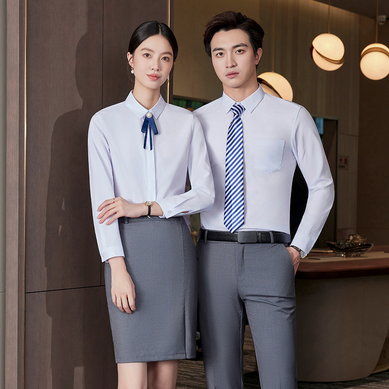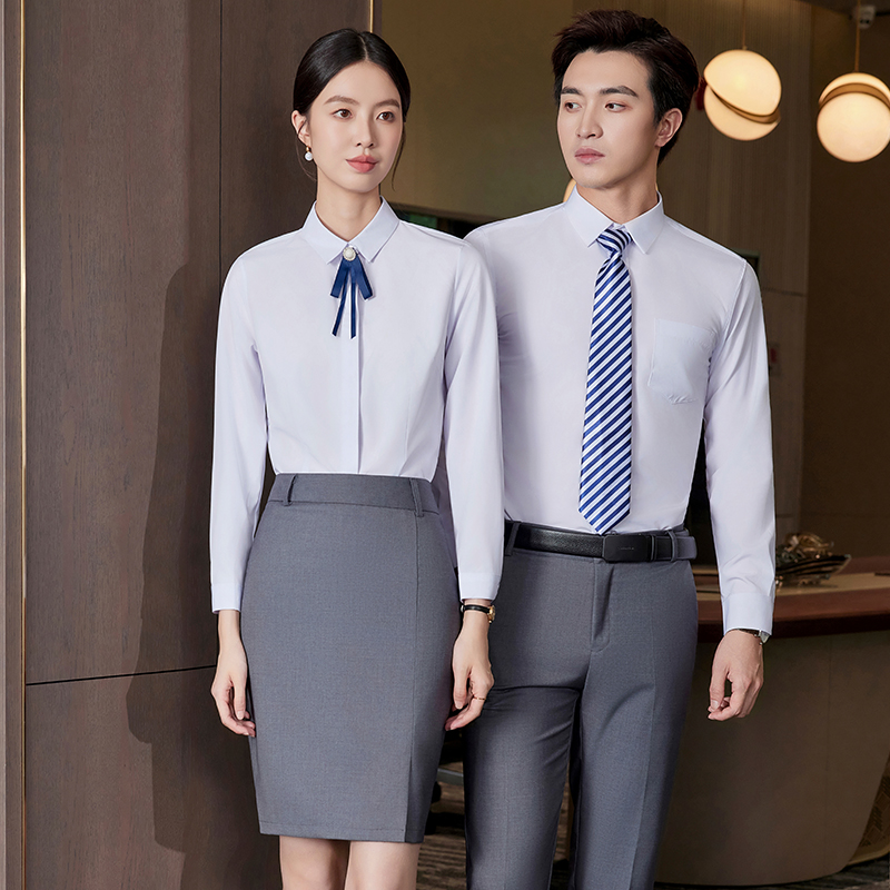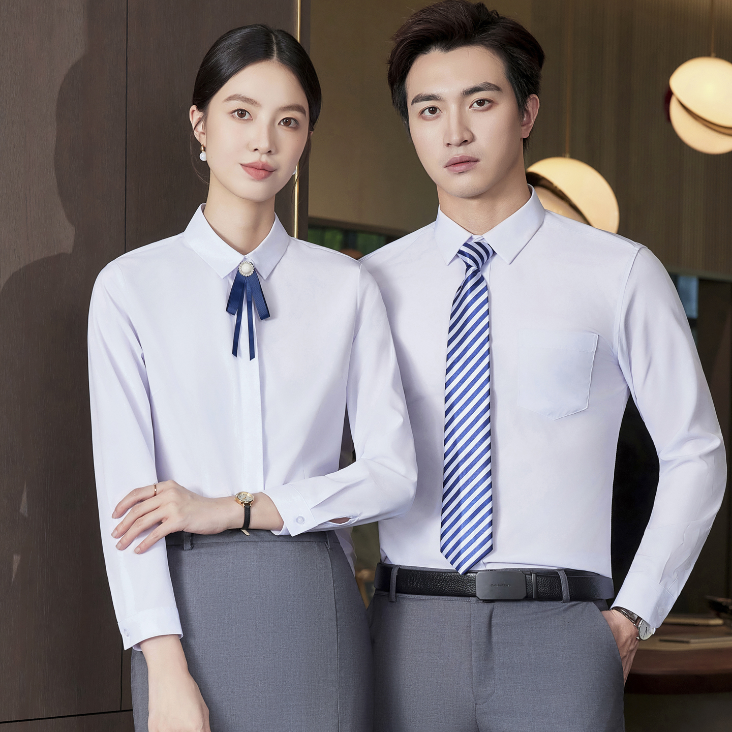 男女同款职业长袖白衬衫灰色弹力免烫衬衣前台服务员工作服送领结