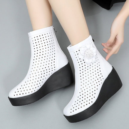 2025新款女鞋短靴春秋单靴坡跟厚底高跟鞋夏季裸靴镂空白色女靴子
