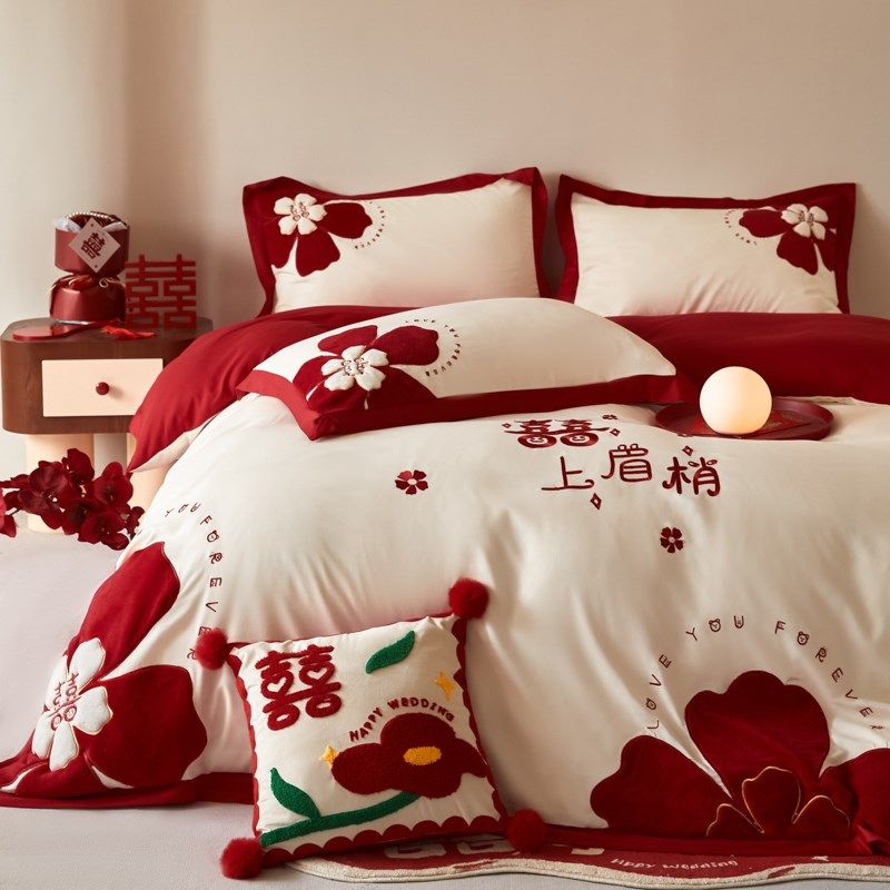 公主风喜字结婚k四件套大红色长绒棉被套床单全棉婚庆床上用品