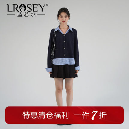 蓝若水大码女装假两件格子翻领针织衫遮肚子胖mm春季新款炸街上衣