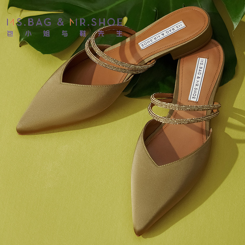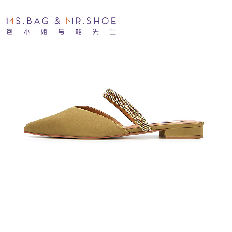 包小姐与鞋先生2025春夏香梨绿条带烫钻平底半凉拖鞋女252445