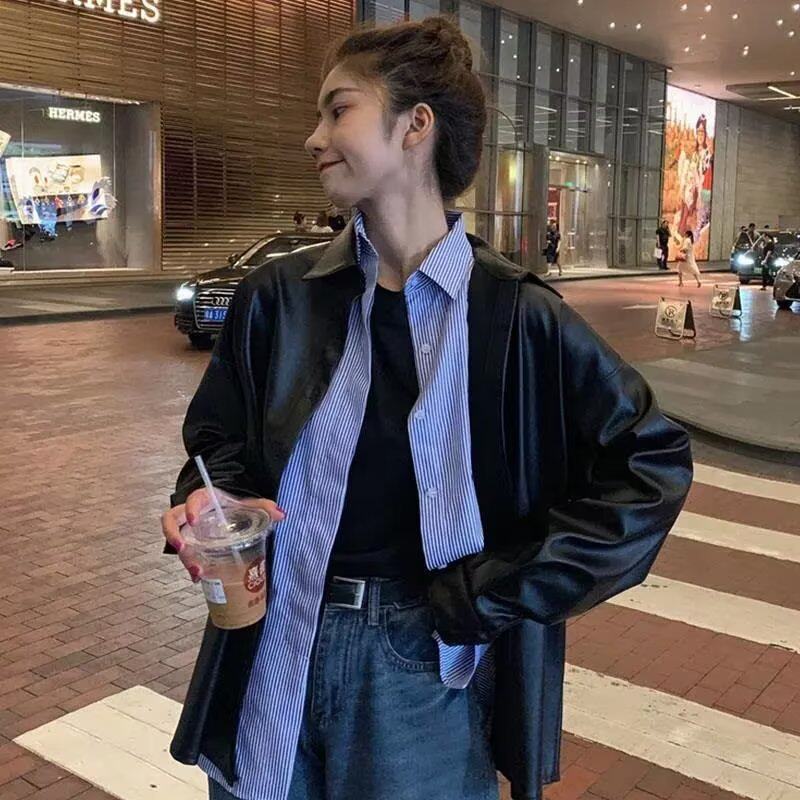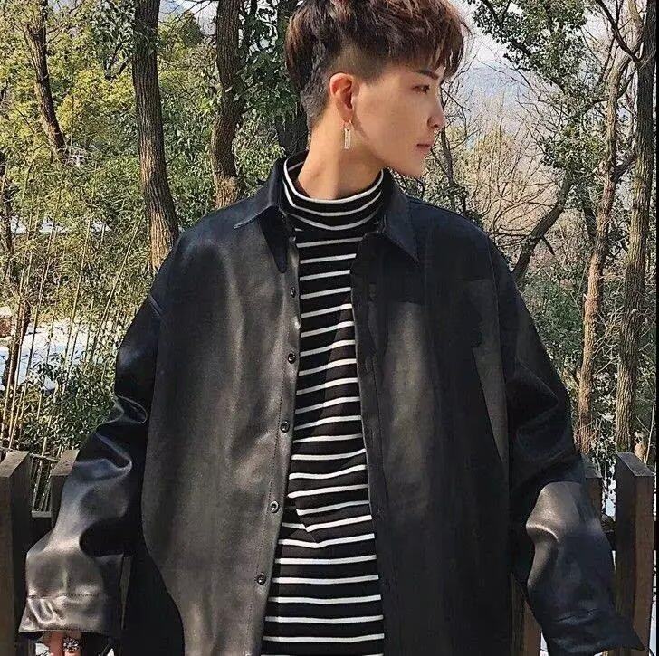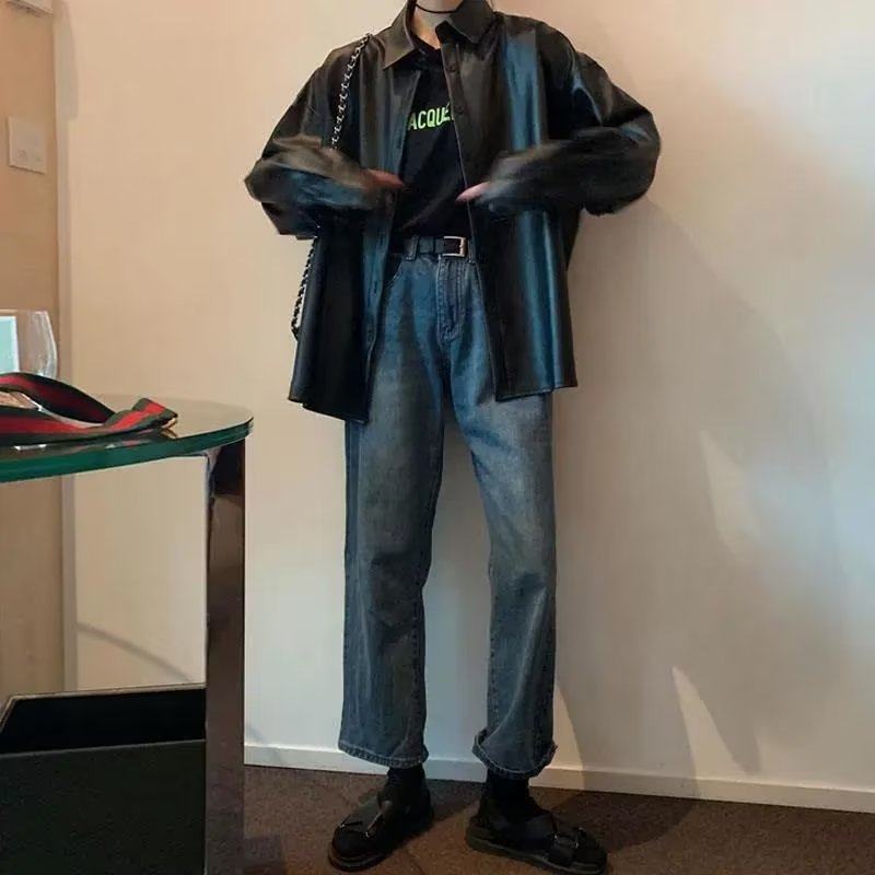 日系oversize纽扣皮衬衫男女宽松原宿中性风炸街翻领pu皮衬衣外套