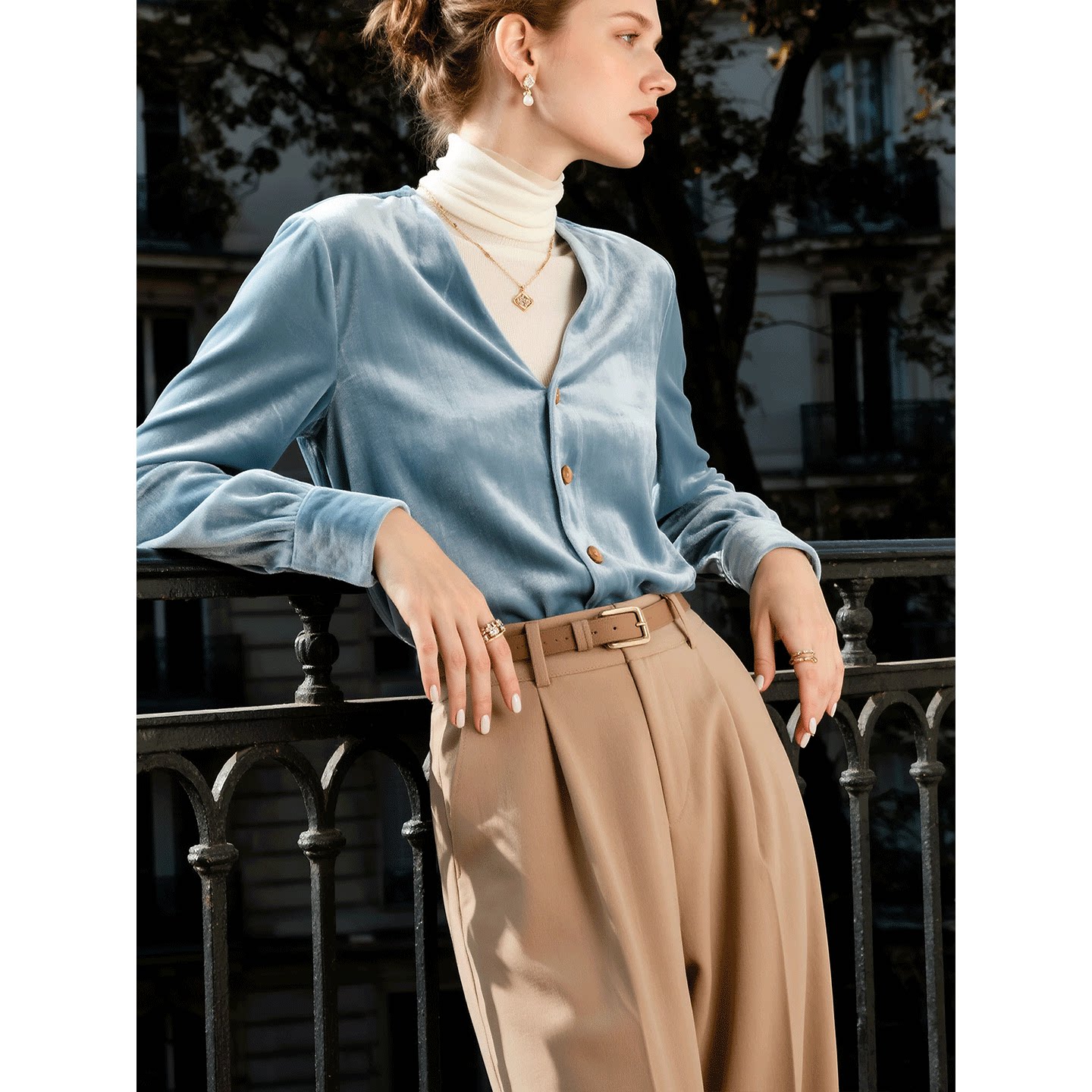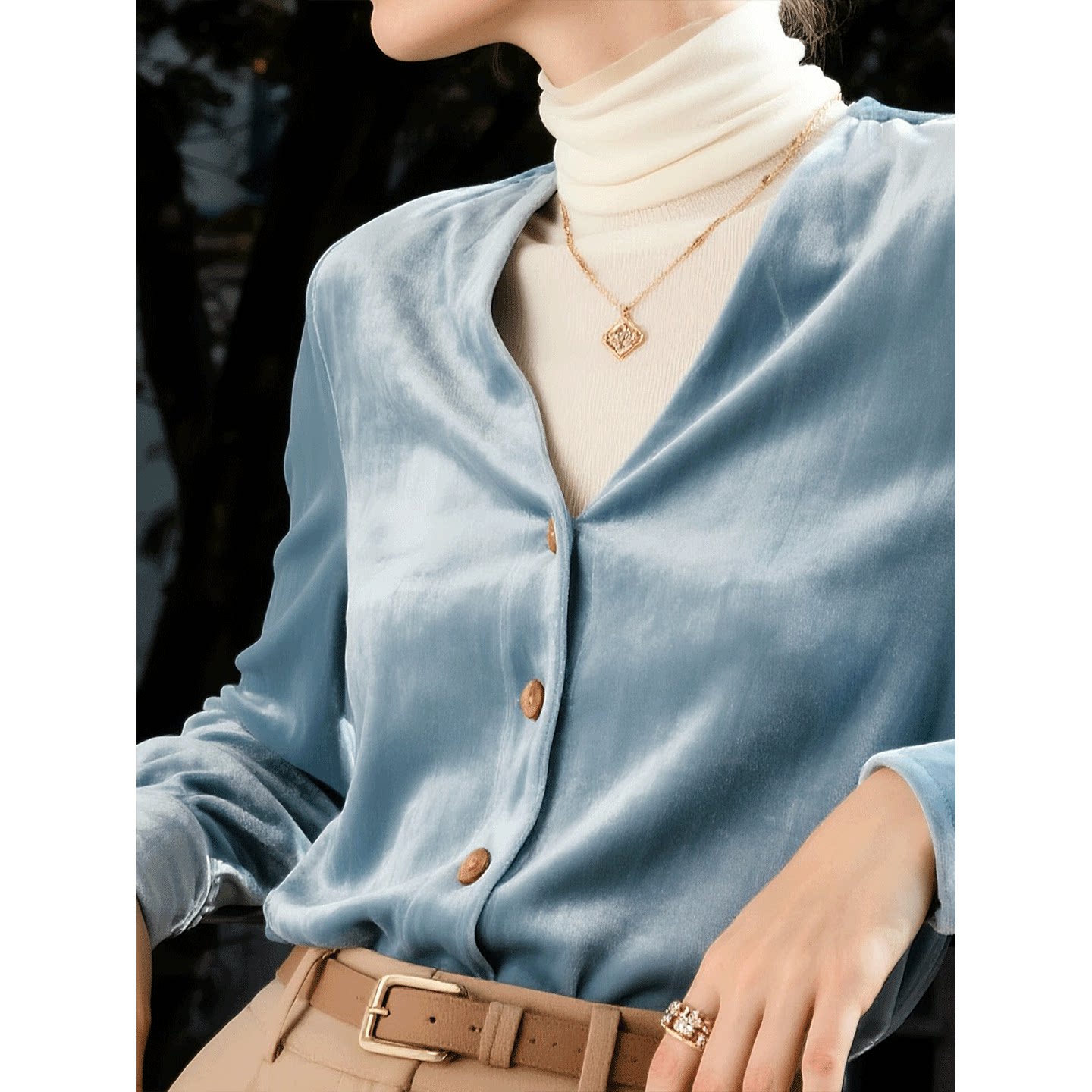 轻熟简约风蓝色丝绒衬衫女2026年秋冬新款长袖V领高级感百搭上衣
