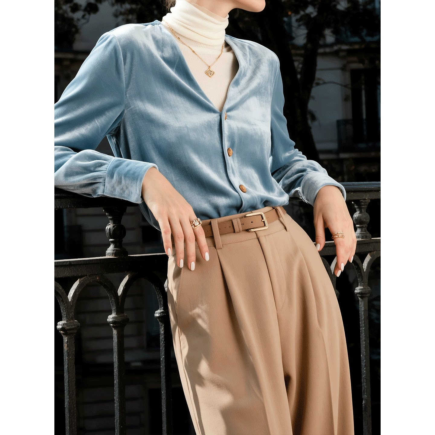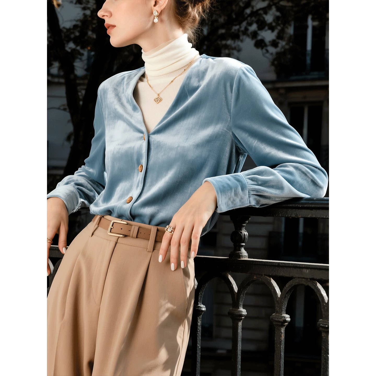 轻熟简约风蓝色丝绒衬衫女2026