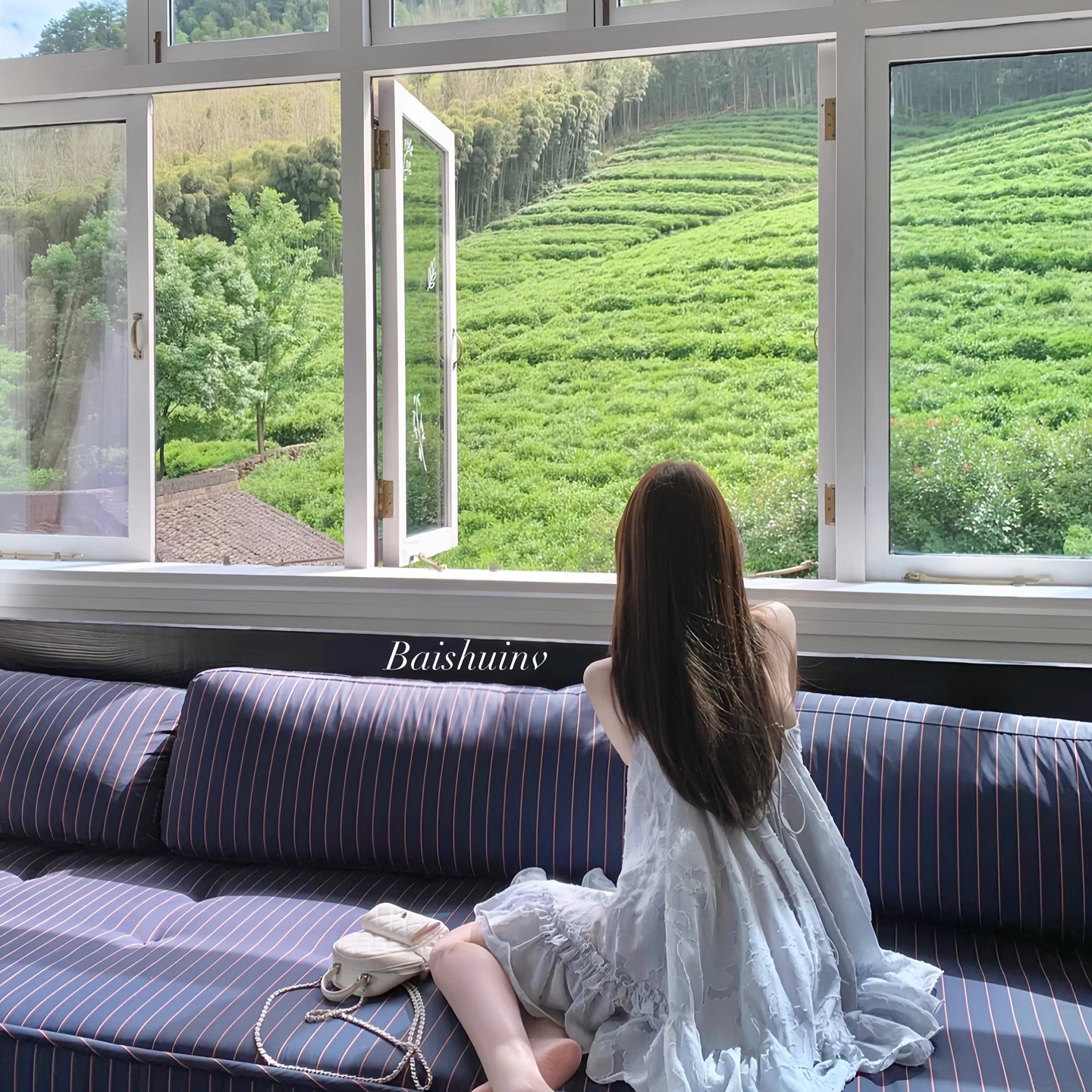 白水女 露思姐姐 蓝色不规则吊带连衣裙女夏海边度假氛围感裙子