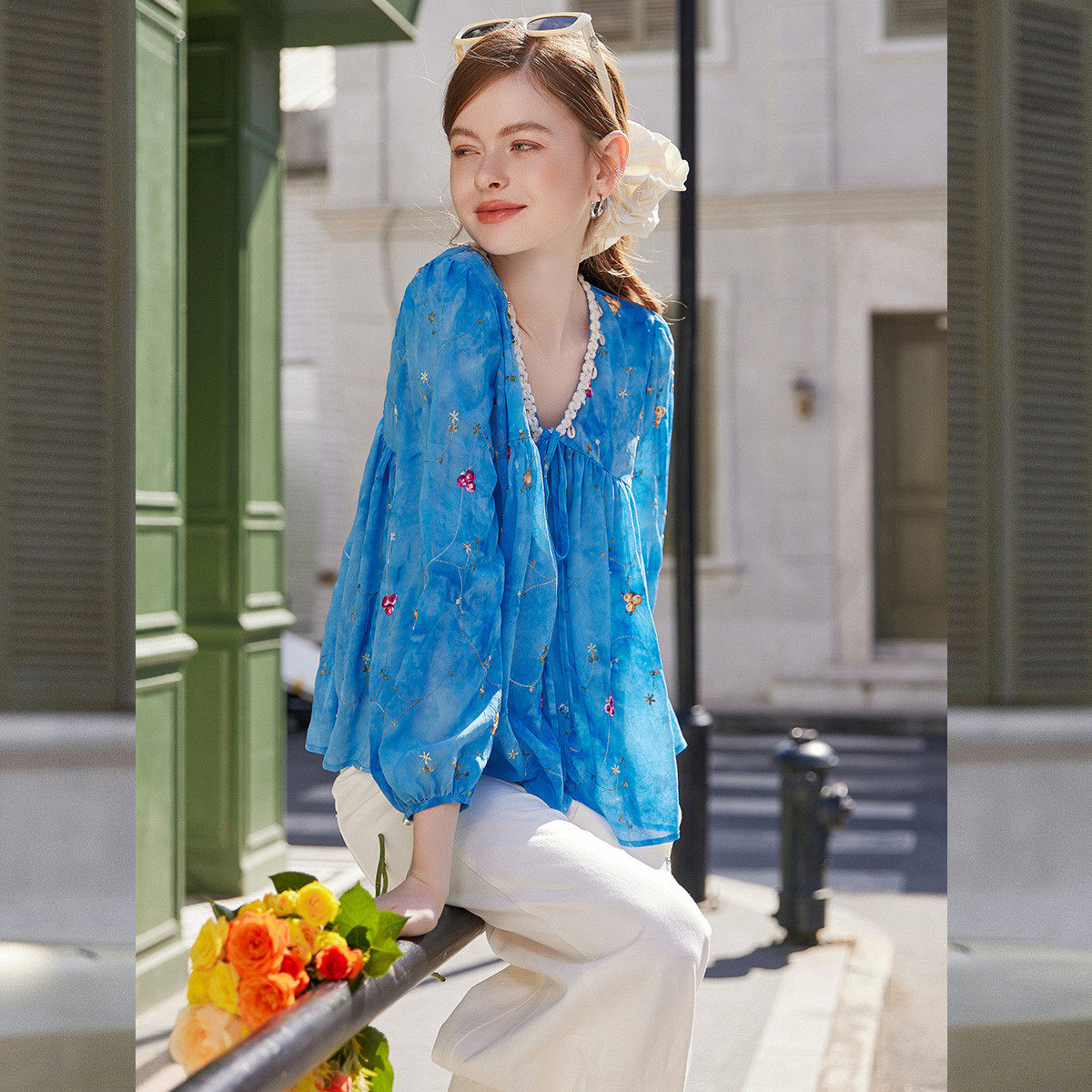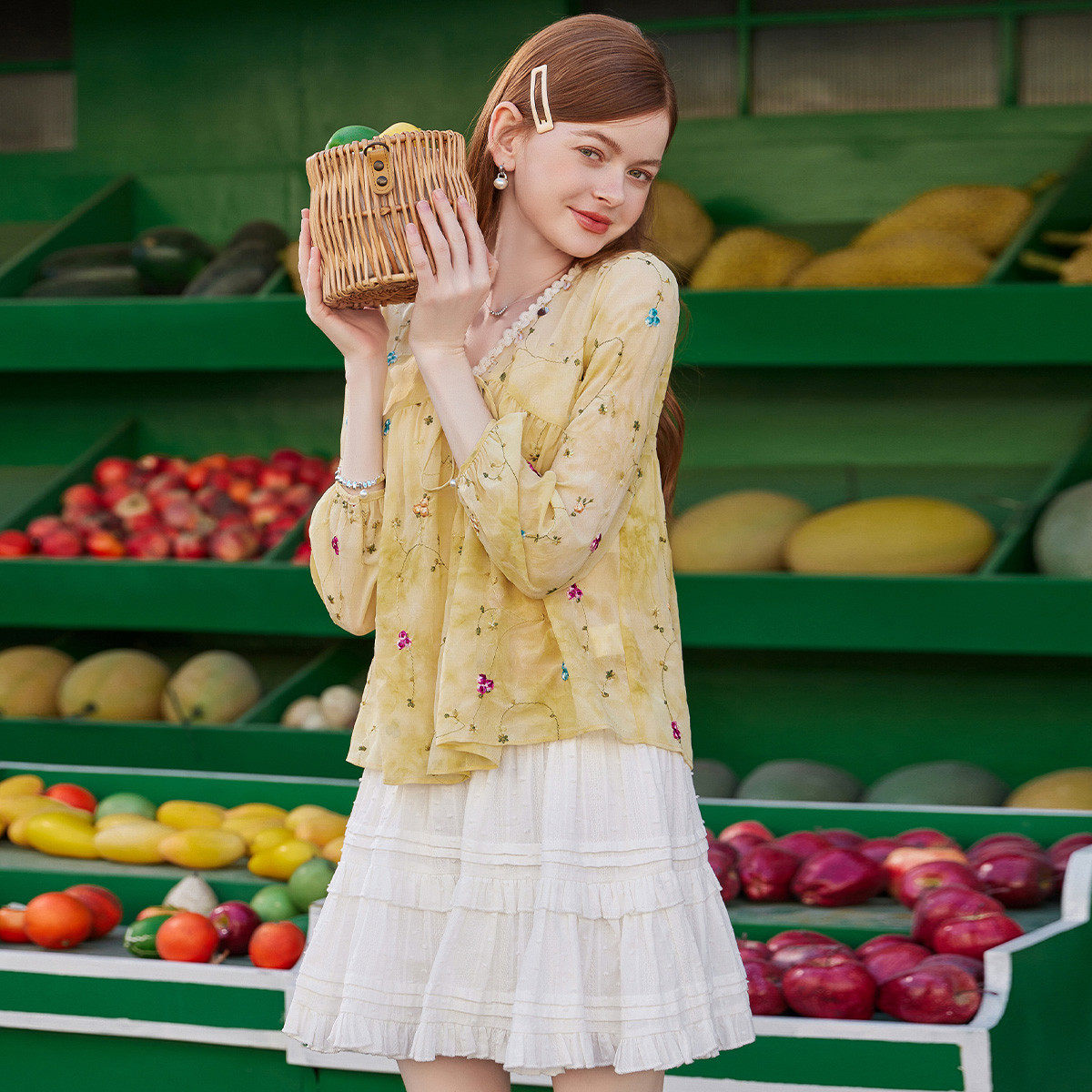 白鹿语法式度假风撞色绣花衬衫26春季新款清新V领系带娃娃衫上衣