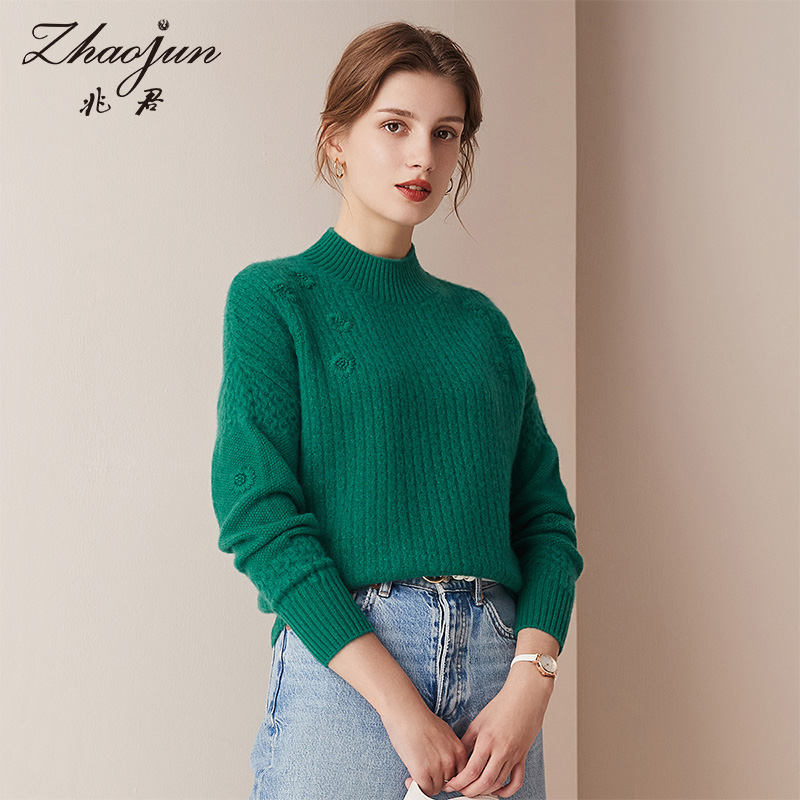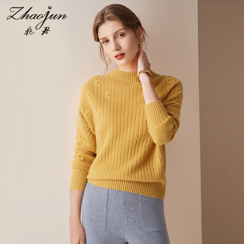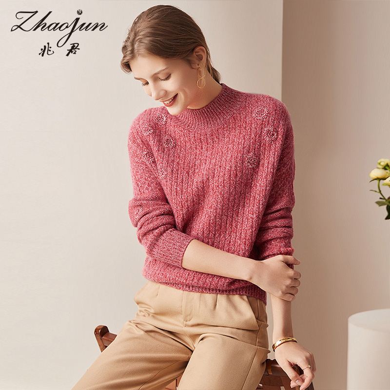 兆君秋冬绣花半高领羊绒衫女 加厚外穿红色毛衣打底针织衫