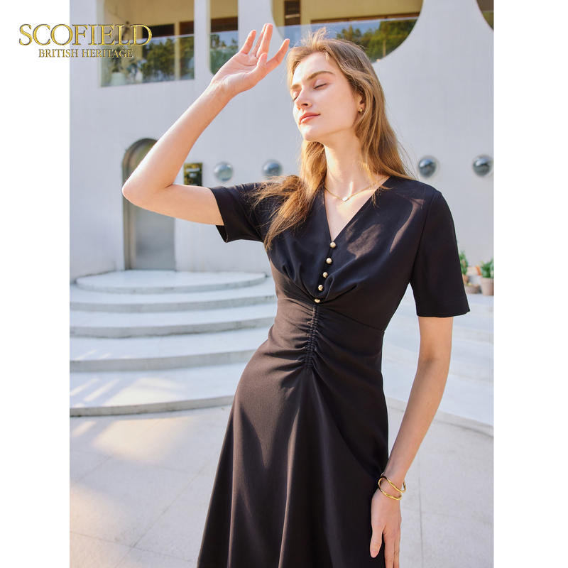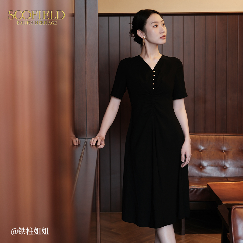 【醋酸】Scofield女复古V领优雅气质垂坠感连衣裙夏季裙子