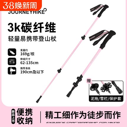 哲客登山杖3K碳纤维碳素登山杖手杖三节伸缩全碳便携中号大号轻硬