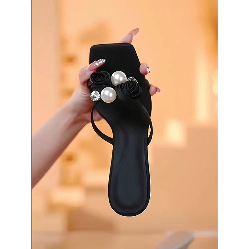 2025夏季新款水钻珍珠花朵时尚高跟一字拖鞋女方头细跟外穿凉拖鞋
