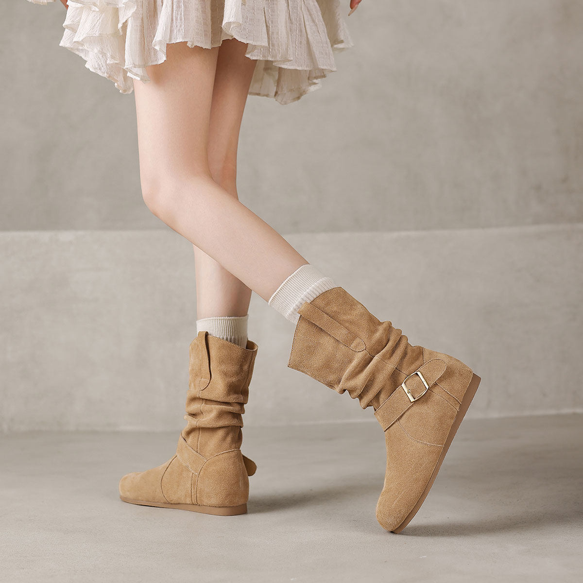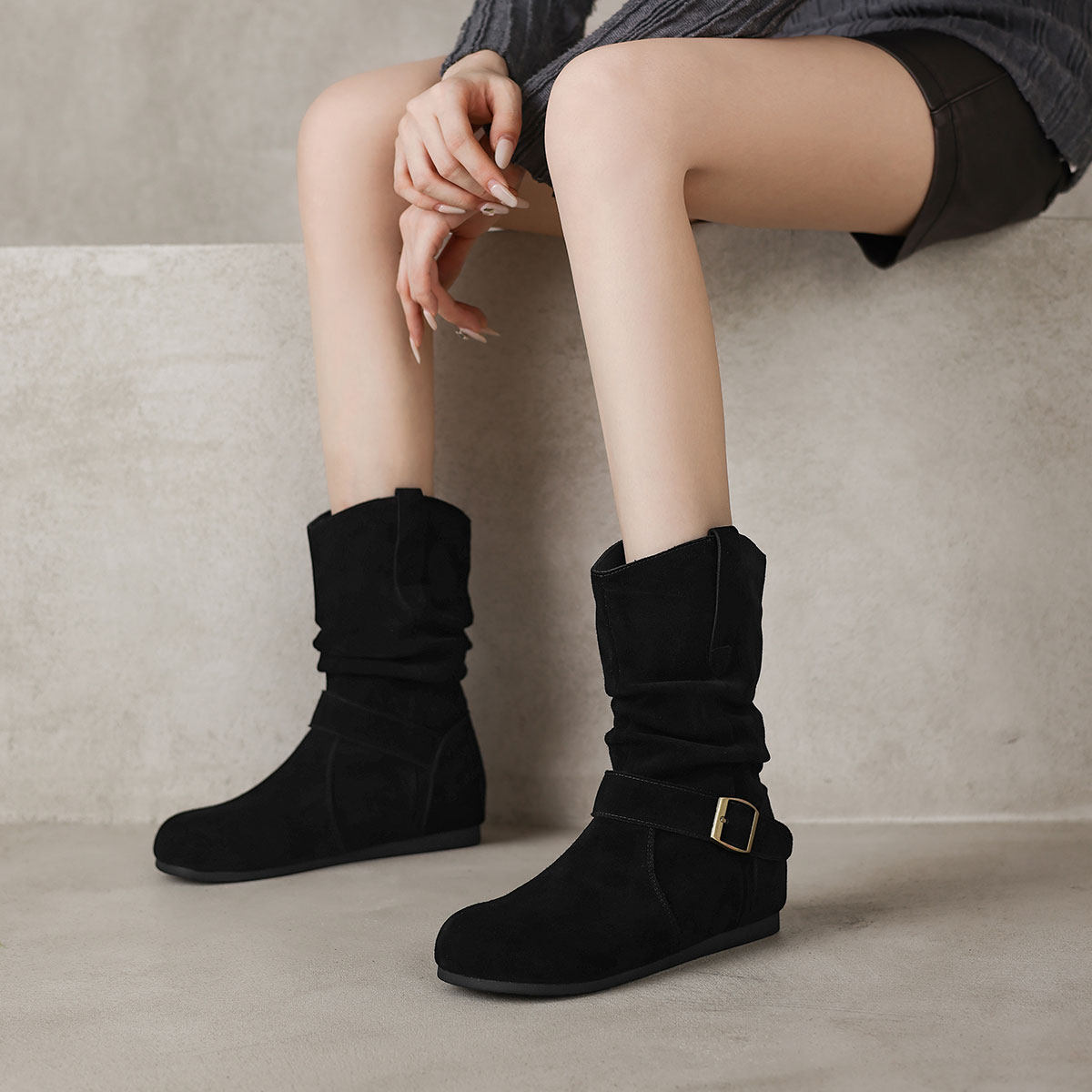 西村名物欧美复古加绒西部靴女2025冬季新款皮带扣百搭短筒堆堆靴