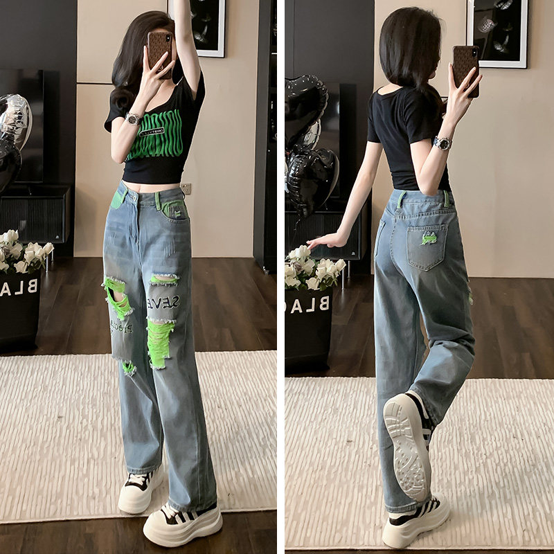 爵士舞破洞牛仔裤时尚套装女夏季露脐短上衣炸街跳舞演出服两件套