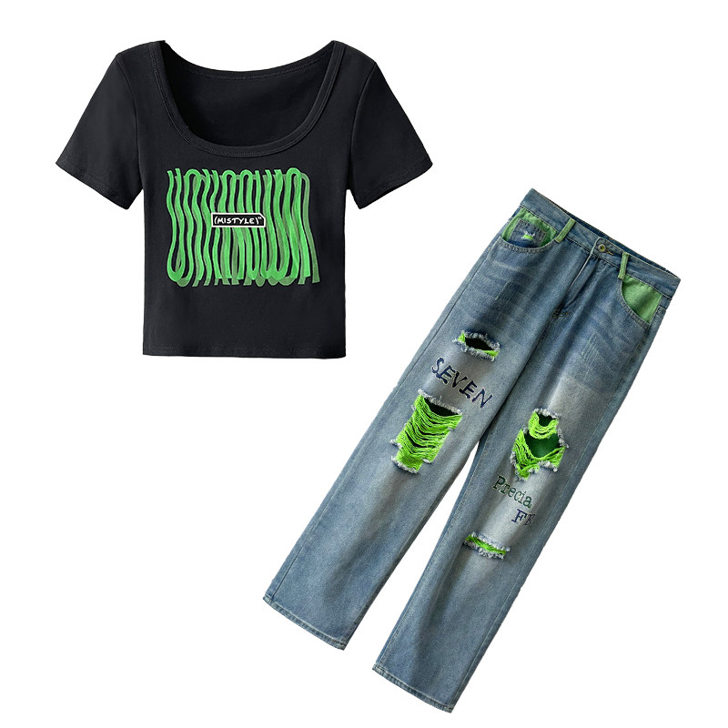 夏季短袖辣妹破洞牛仔裤时尚套装