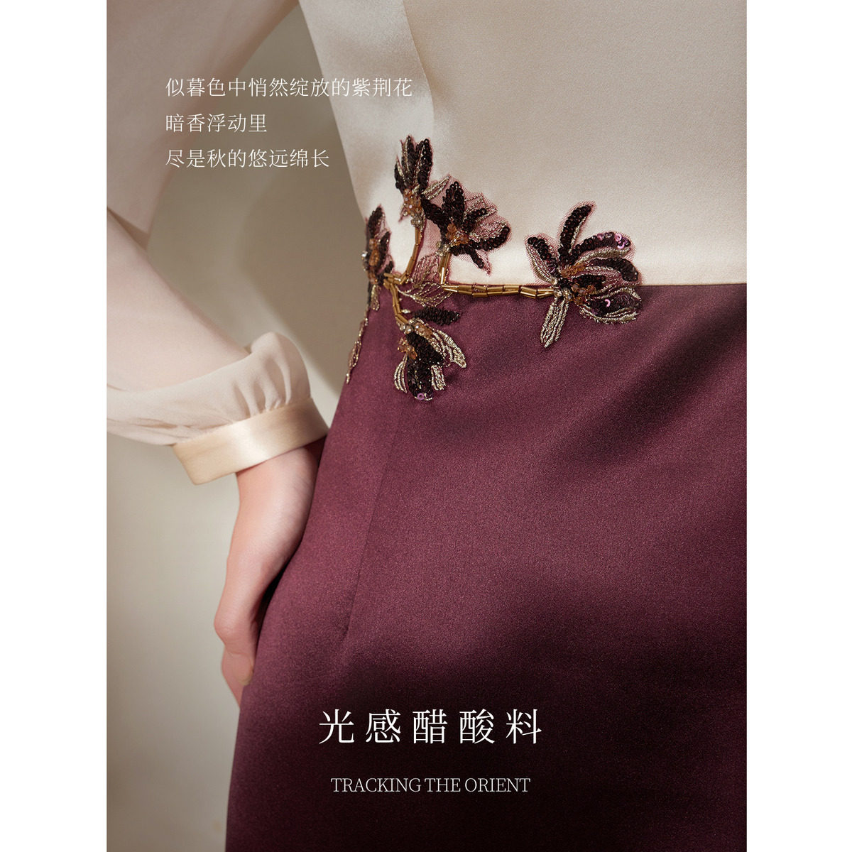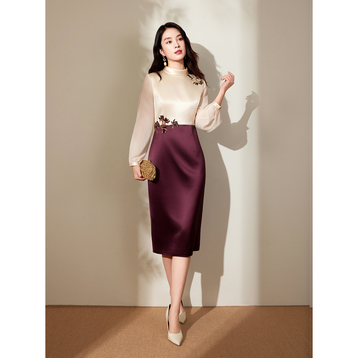 【东方雅致】粉蓝衣橱春秋装新款撞色拼接立领刺绣精致礼服连衣裙